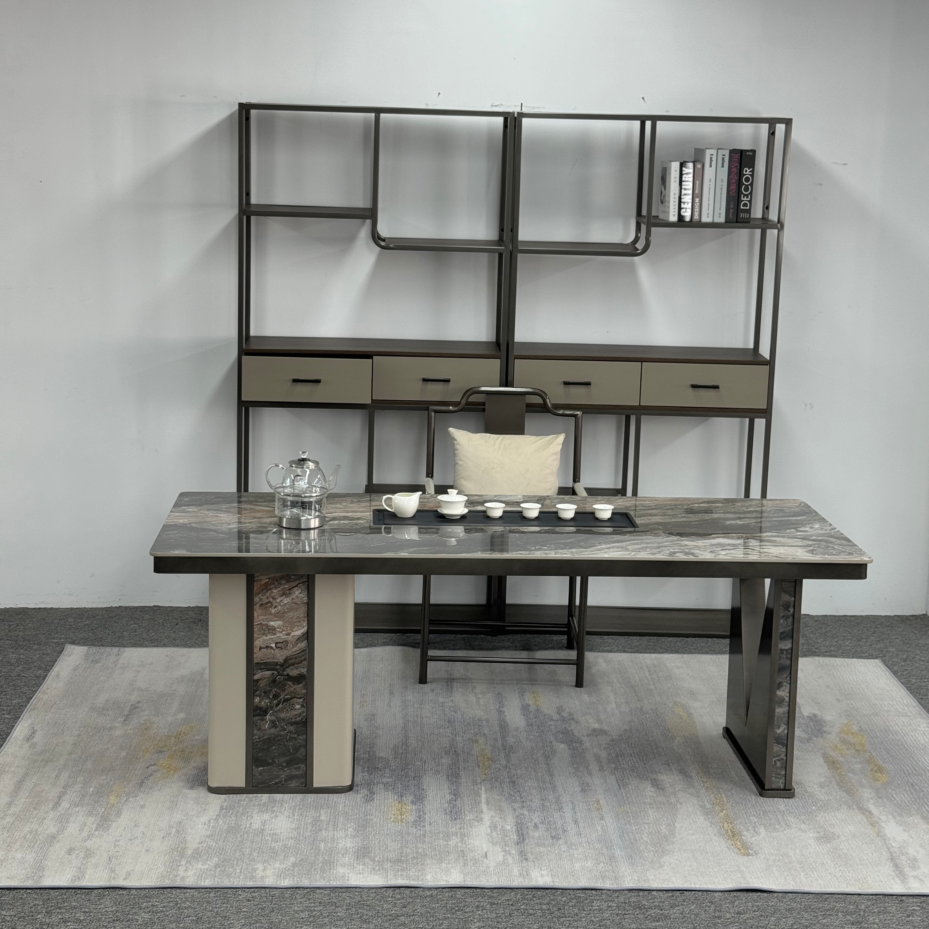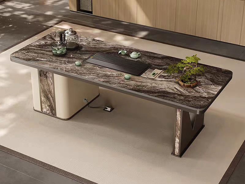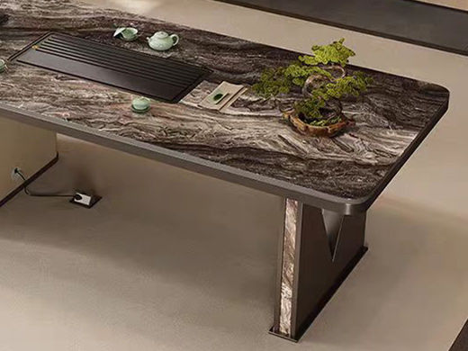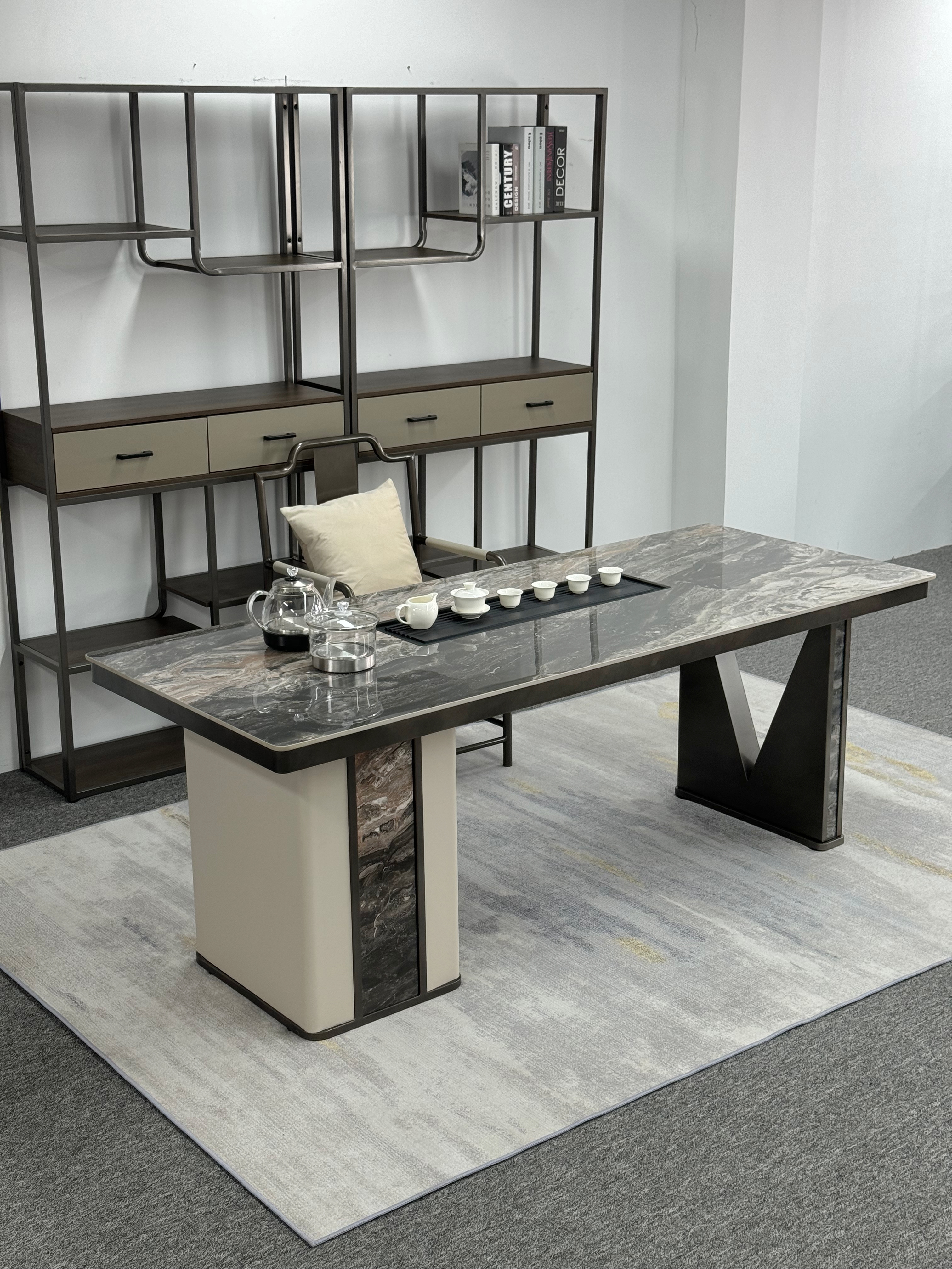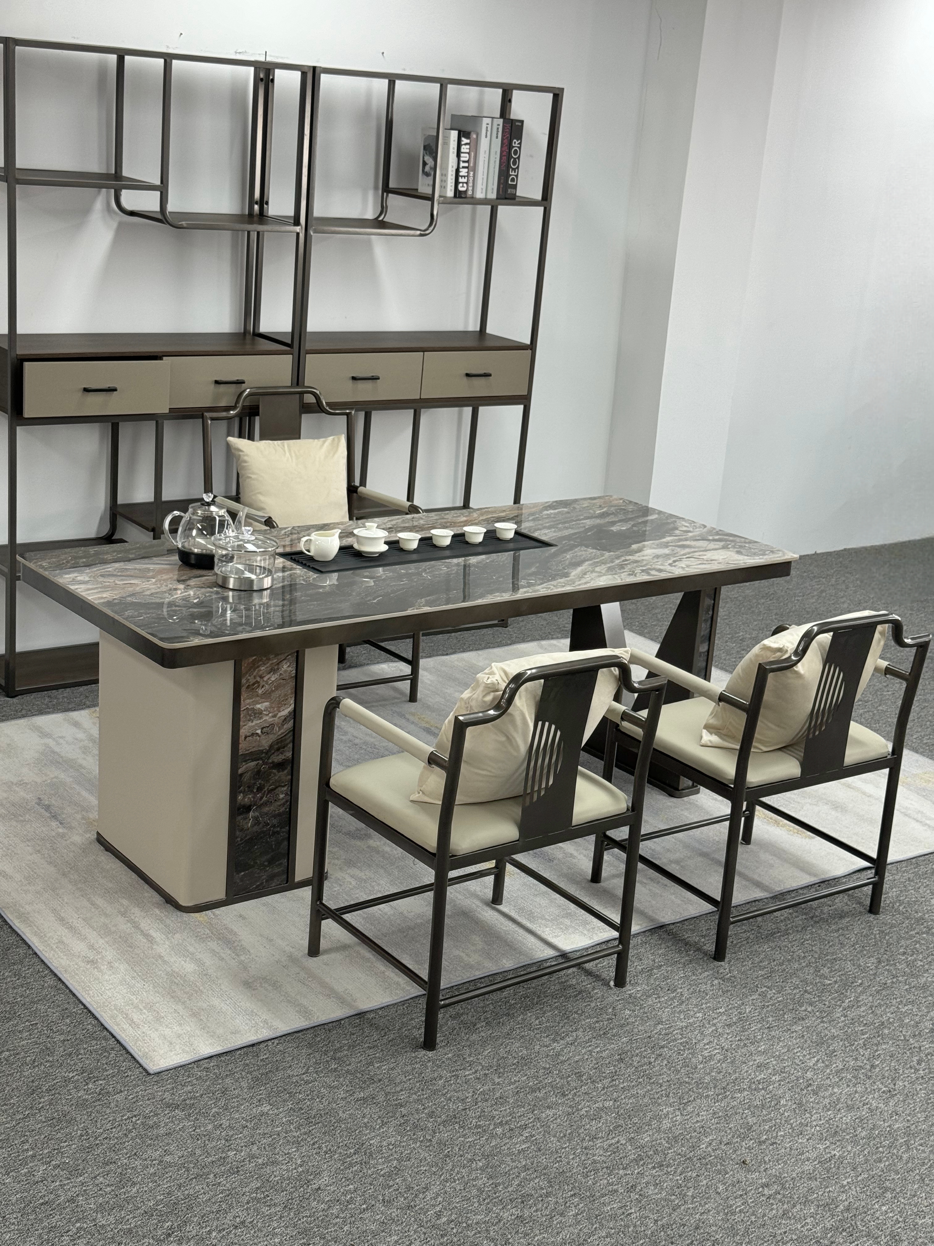 上铭轩 轻奢 香奈儿岩板+E1中纤板+碳素钢五金+电茶炉+一桌三椅 1.8米茶书桌¥7565
