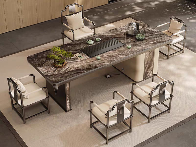 上铭轩 轻奢 木纹岩板拼接威尼斯棕岩板+碳素钢五金+电茶炉+高回弹海绵+仿真皮+一桌五椅(不含茶具) 1.8米岛台 茶台¥5645