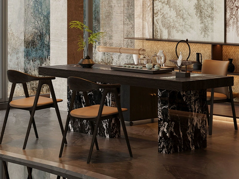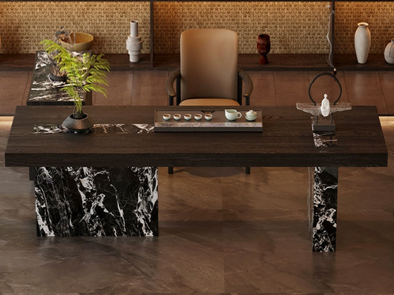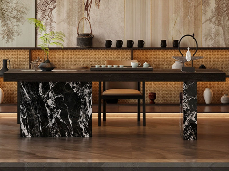 上铭轩 极简 100MM面板+实木多层板贴天然白蜡木木皮面板(开放黑)+内部带有抽屉+实木板多层贴岩板脚架(宝格丽黑) 岛台 茶台