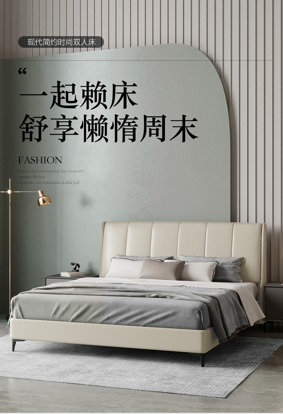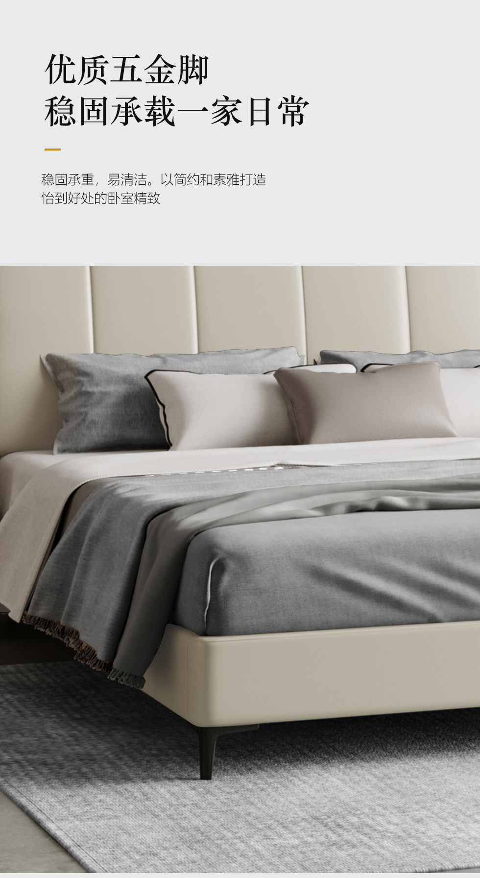 非凡工艺 现代简约简约 接触面真皮+仿皮+木框架高密 度回弹海绵+静音防滑实木十分排骨条+五金脚+静音条 1.8米 真皮软床 |