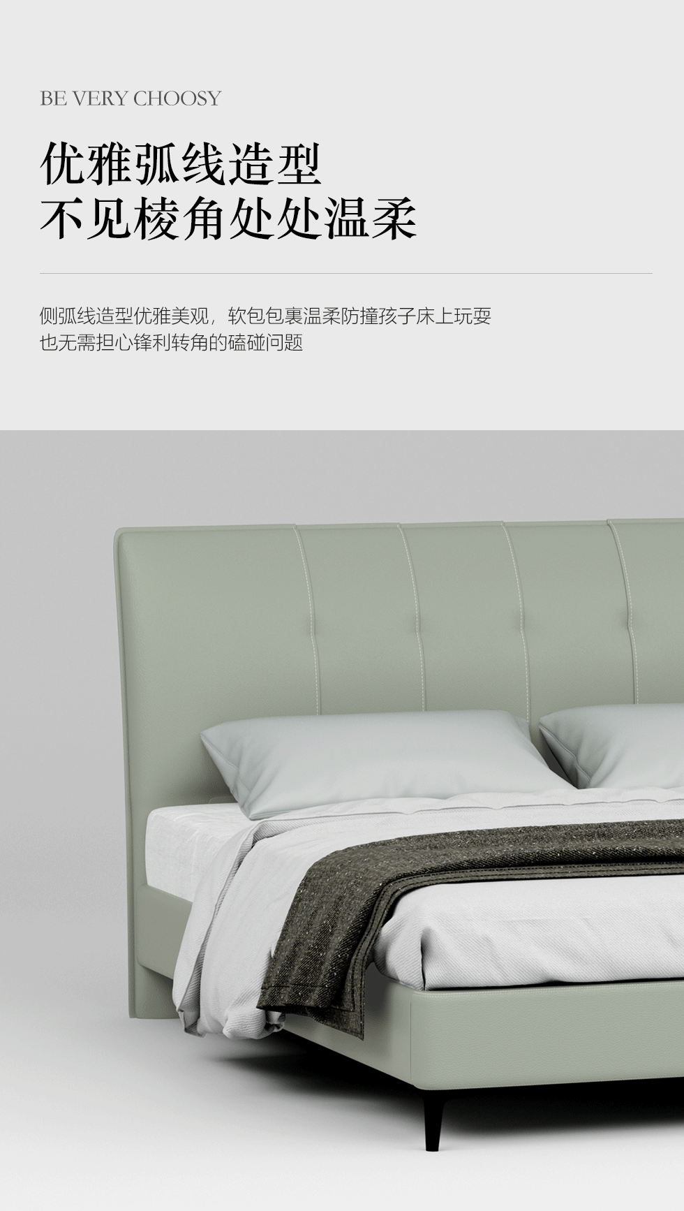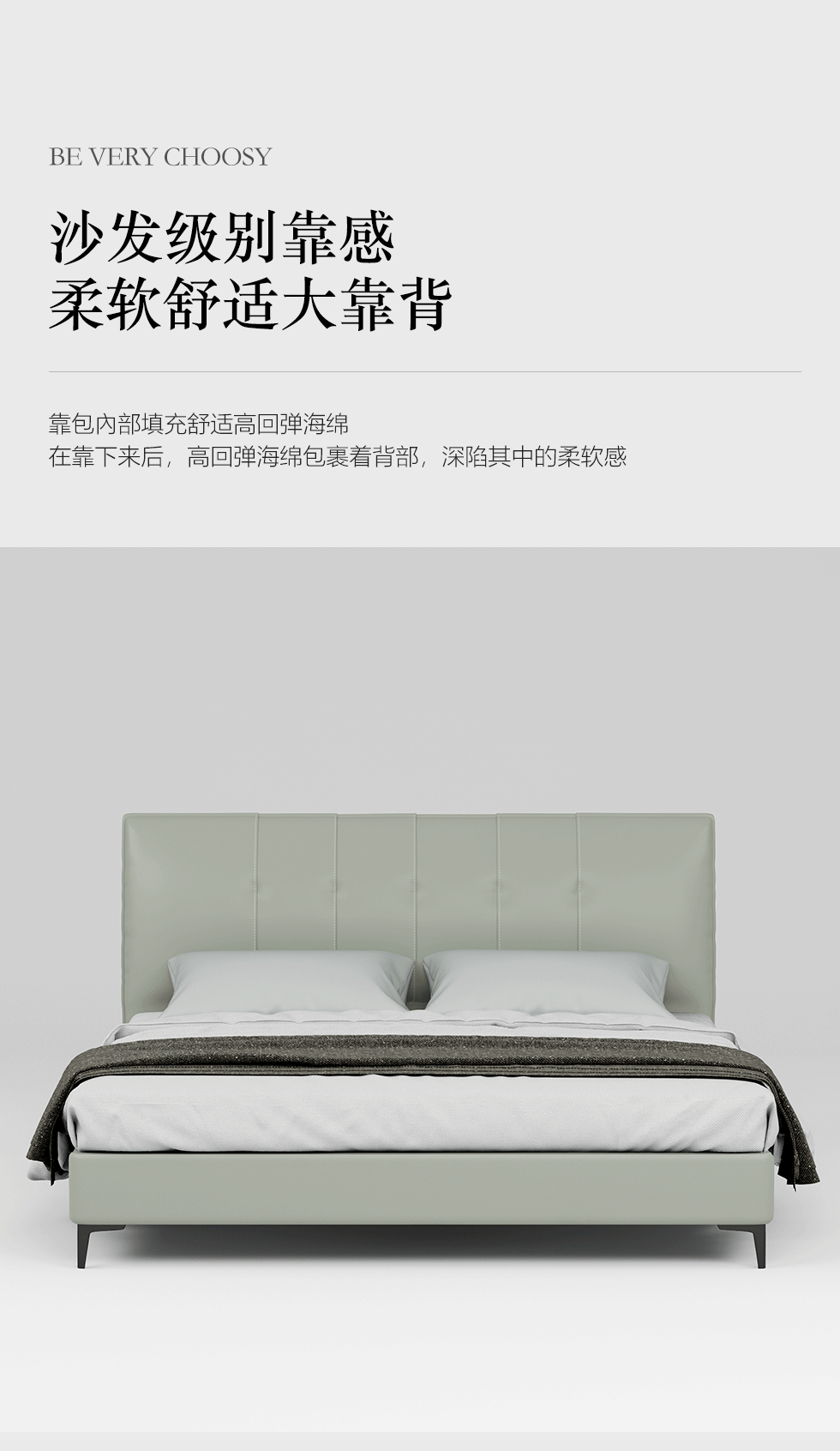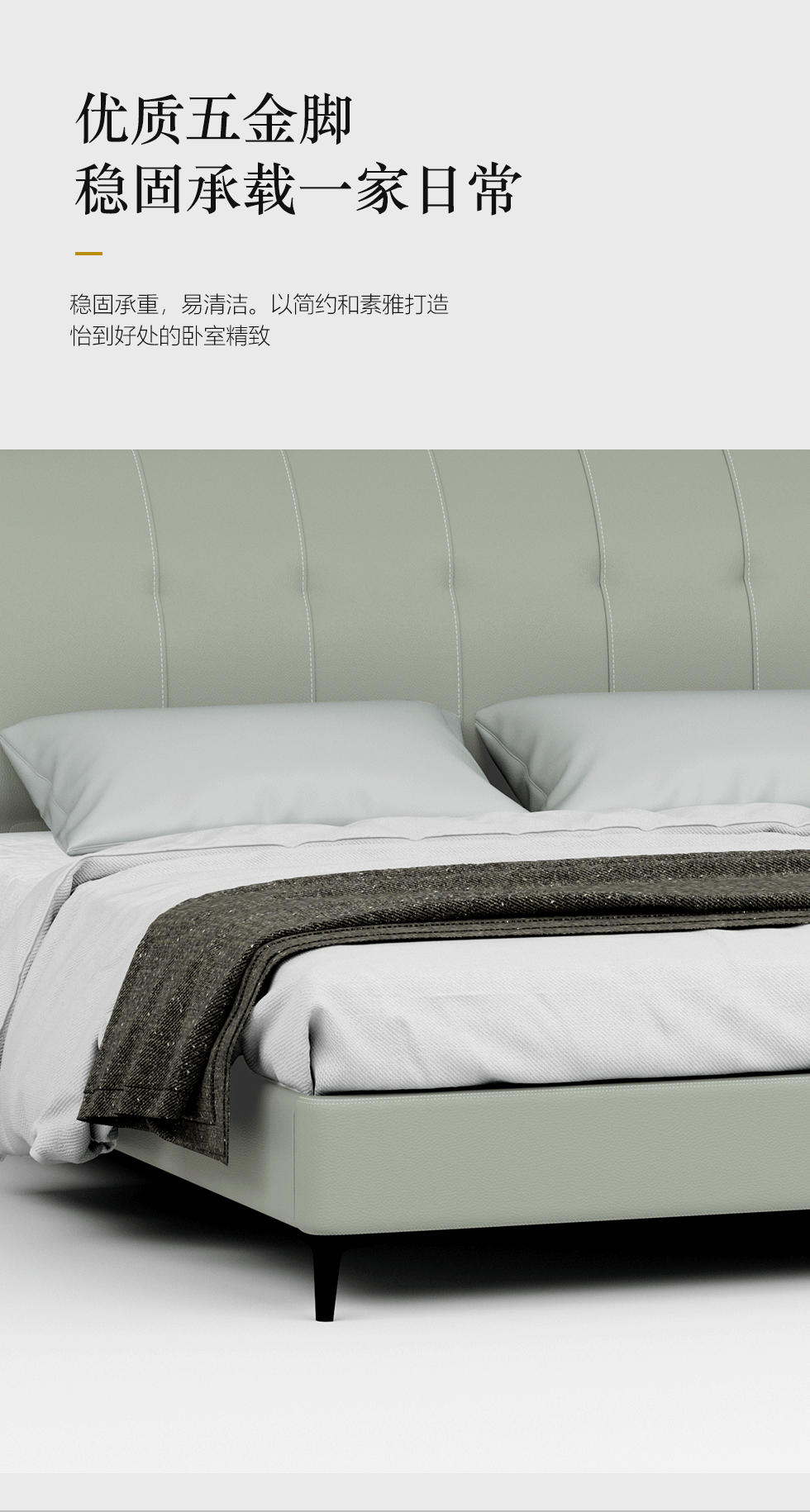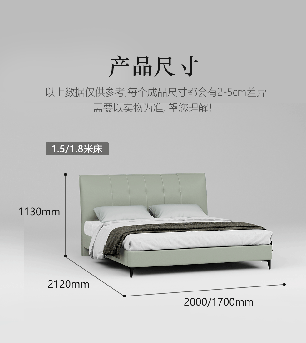 非凡工艺 现代简约 接触面真皮+仿皮+木框架高密 度回弹海绵+静音防滑实木十分排骨条+五金脚+静音条 浅绿色 1.8米 真皮软床 |