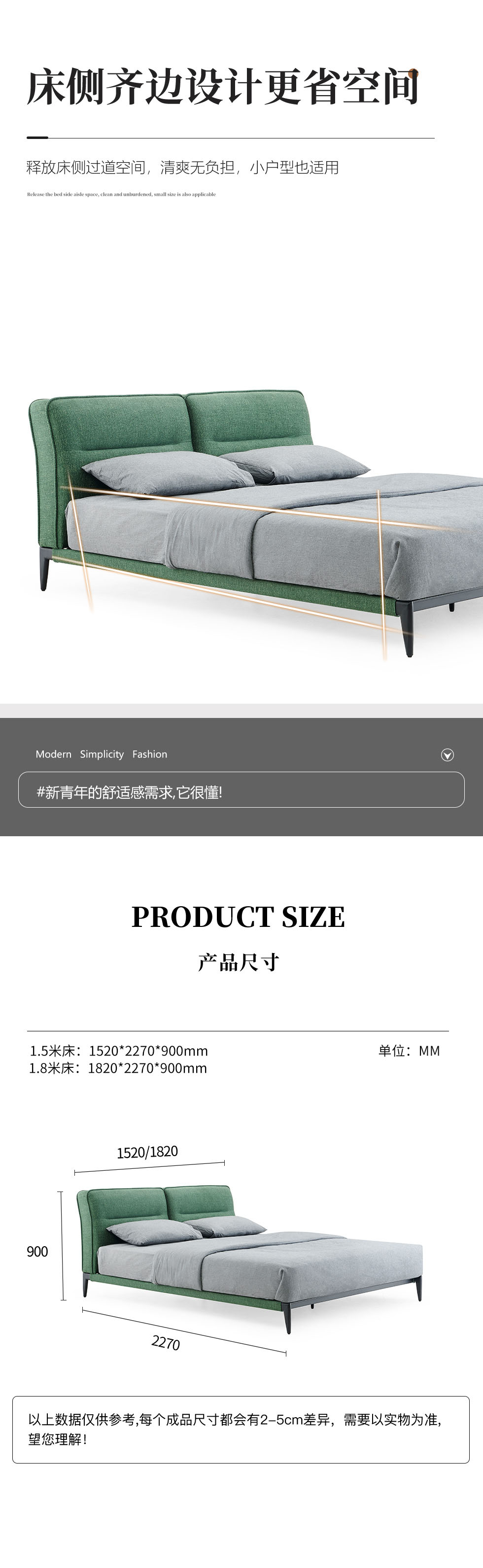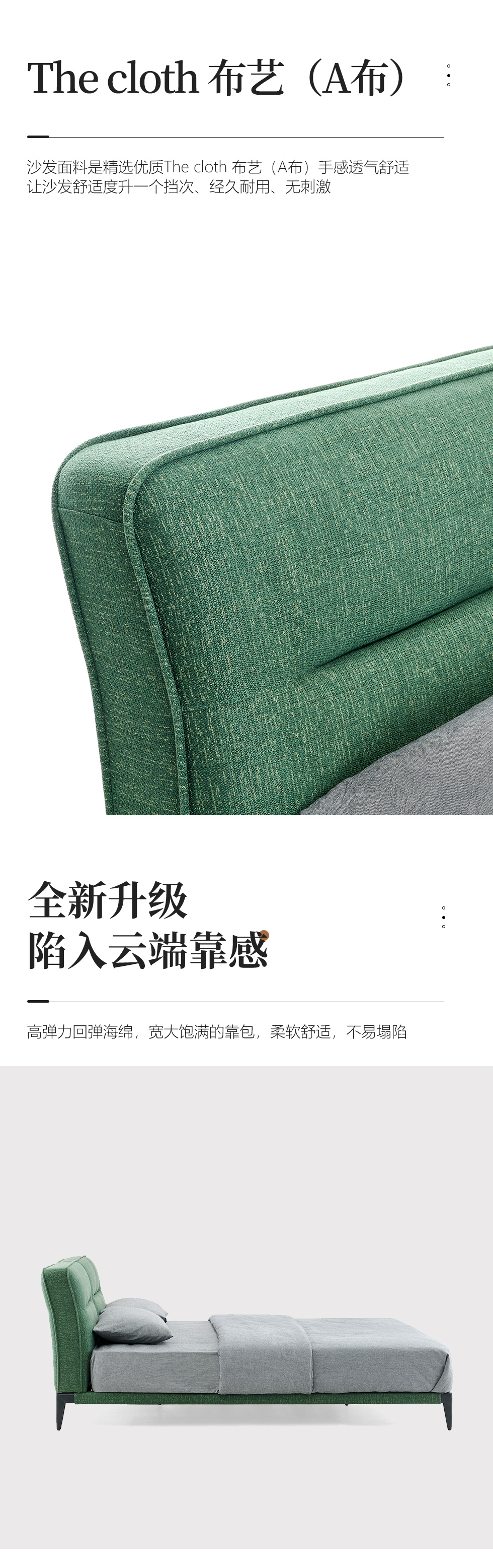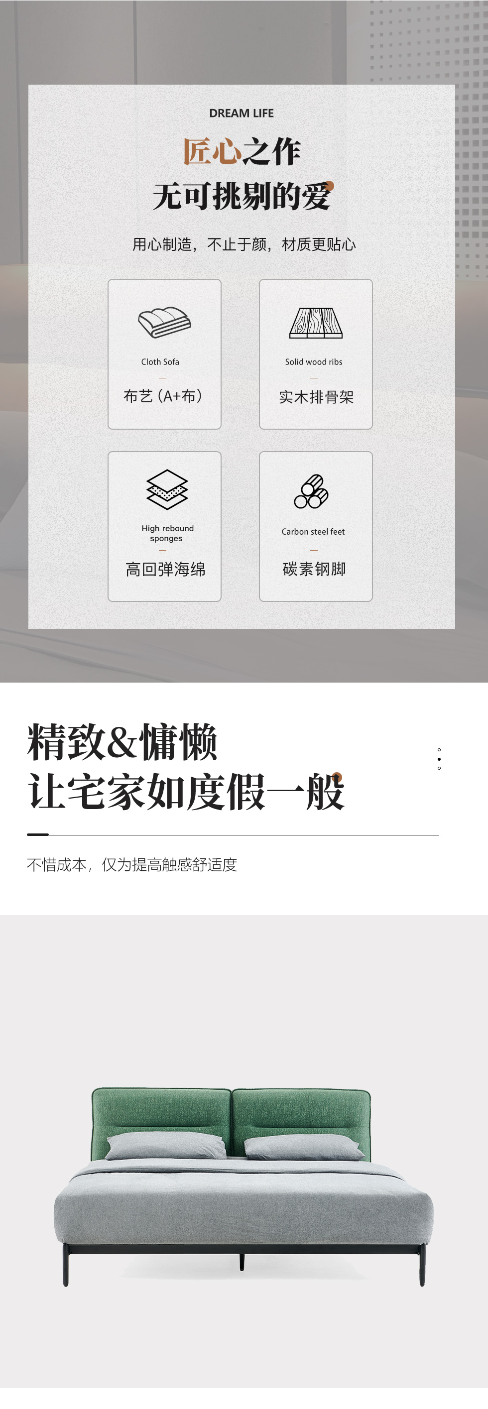 缔造 极简 纳米防污布+实木排骨架+羽丝棉+高密度海棉+碳素钢脚 1.8米布床
