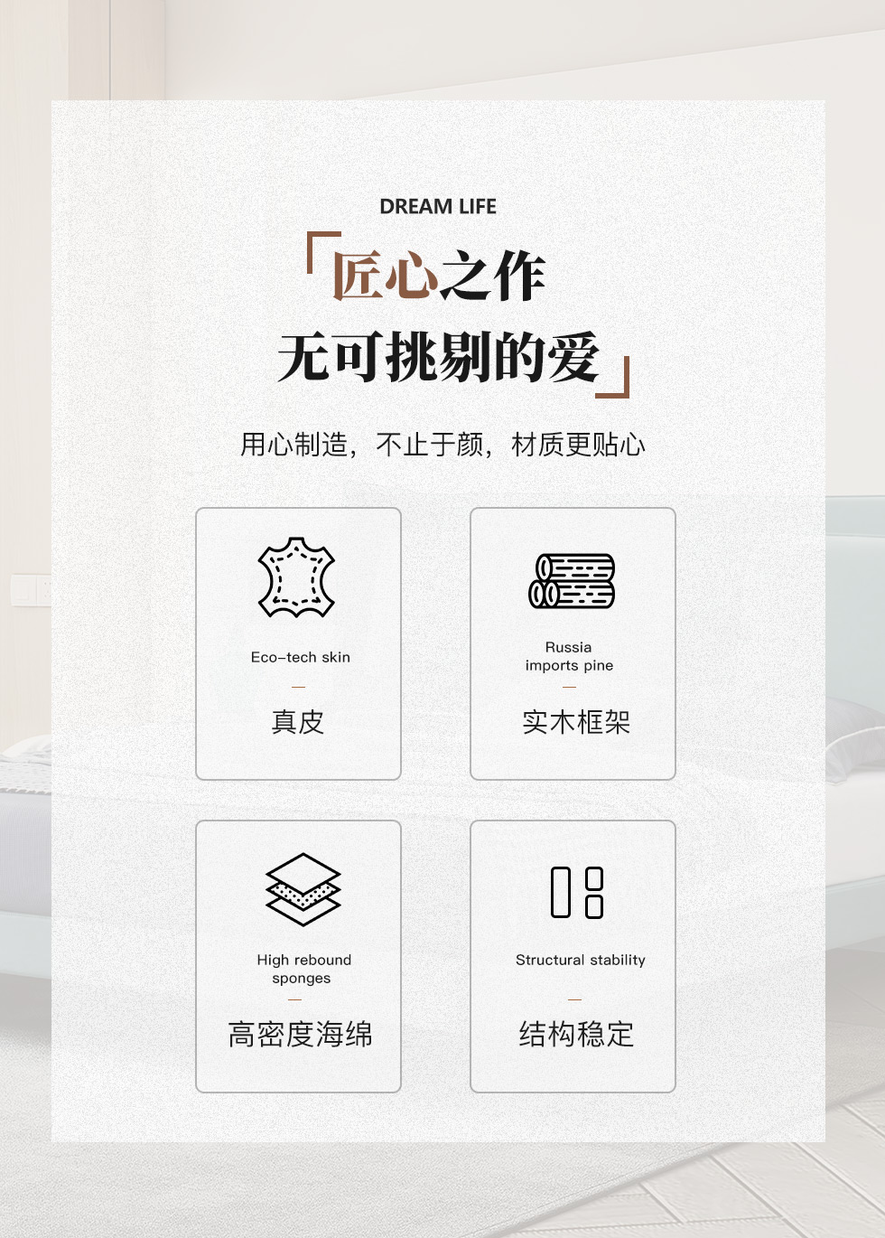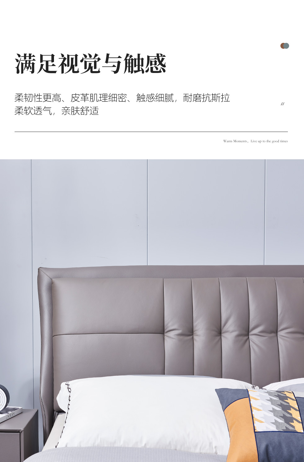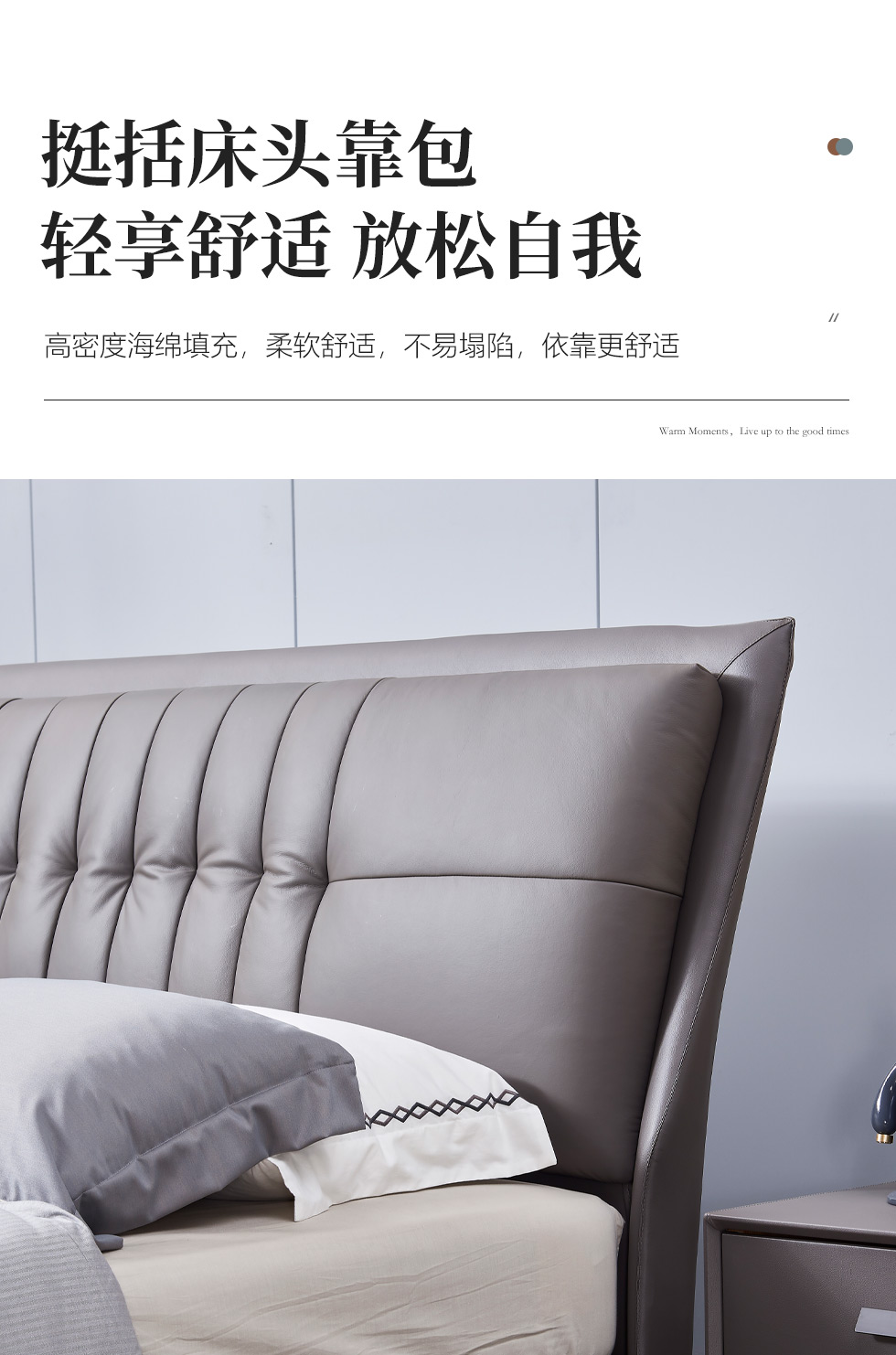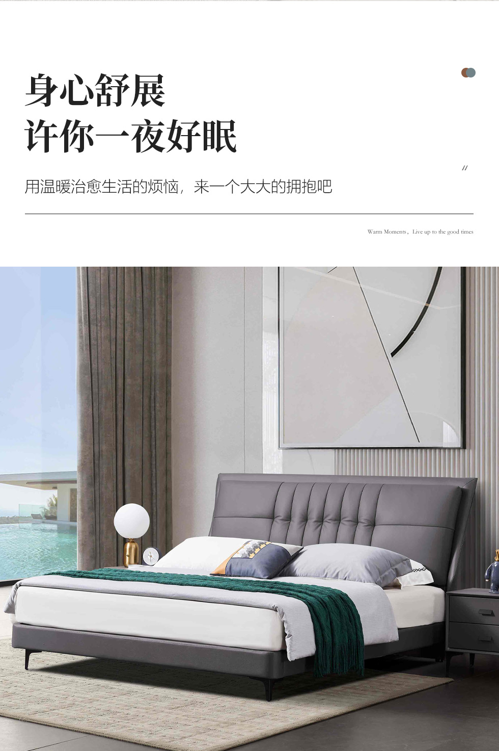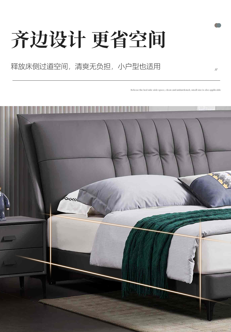 B系优选 现代简约 接触面头层牛皮+仿皮+高回弹海绵+实木框架+10分钢木排骨架+白蜡木床边 1.8米床¥3728