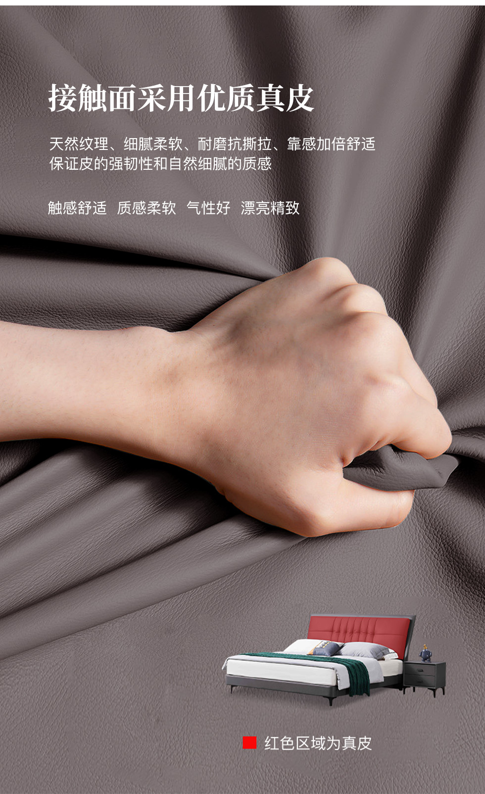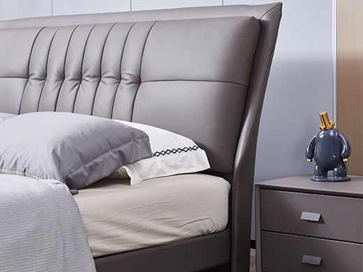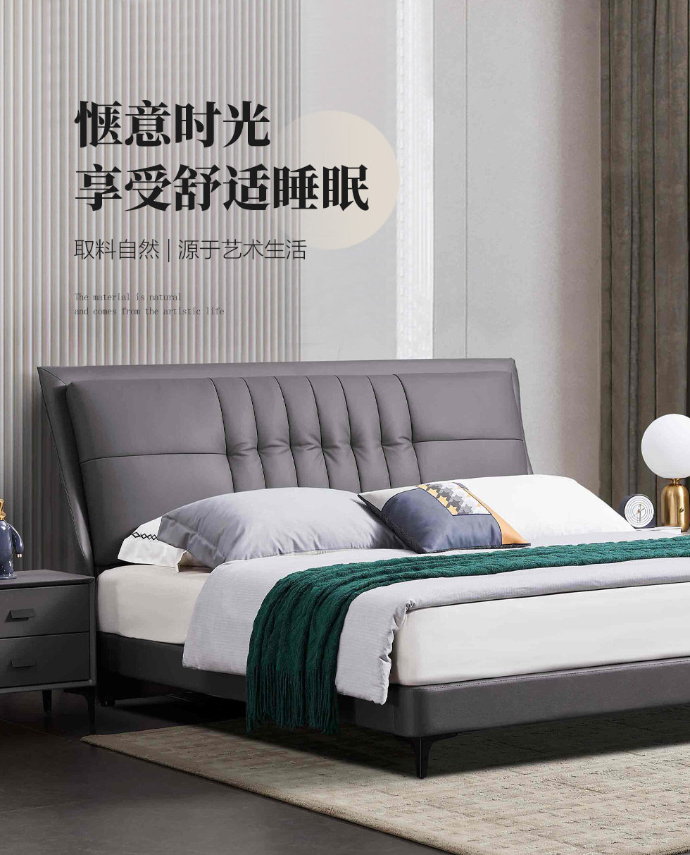 B系优选 现代简约 接触面头层牛皮+仿皮+高回弹海绵+实木框架+10分钢木排骨架+白蜡木床边 1.8米床