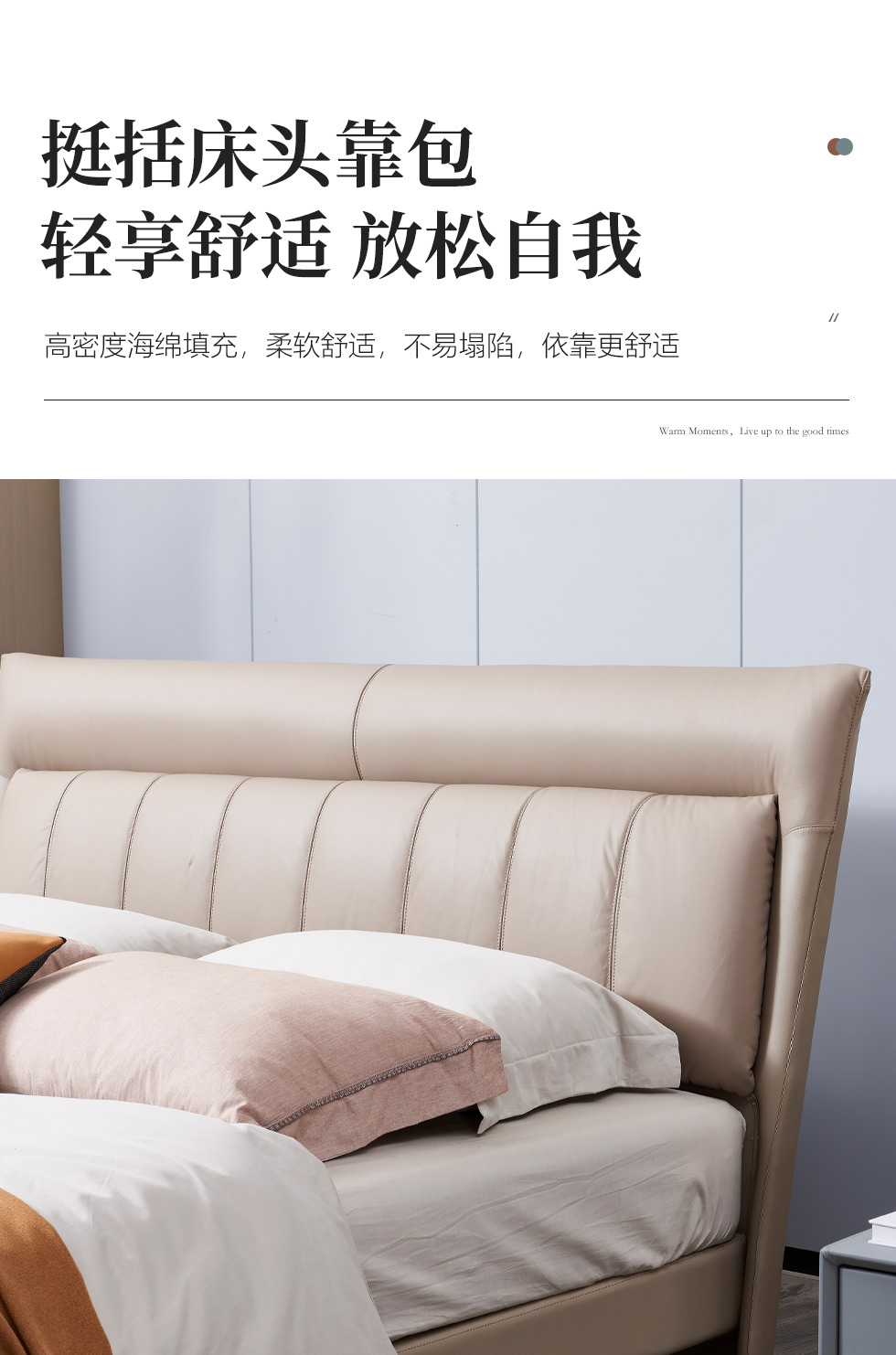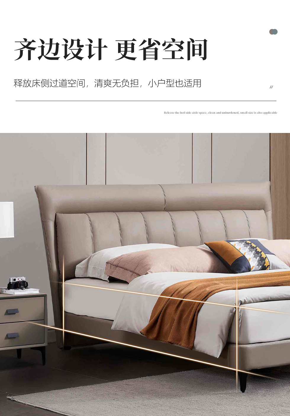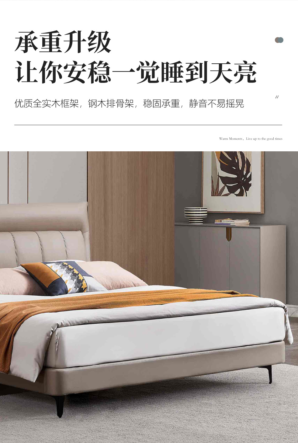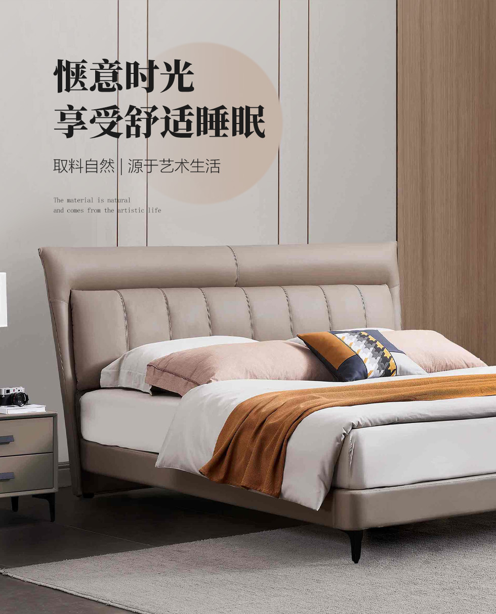 B系优选 现代简约 接触面头层牛皮+仿皮+高回弹海绵+实木框架+10分钢木排骨架+白蜡木床边 1.8米床¥3728