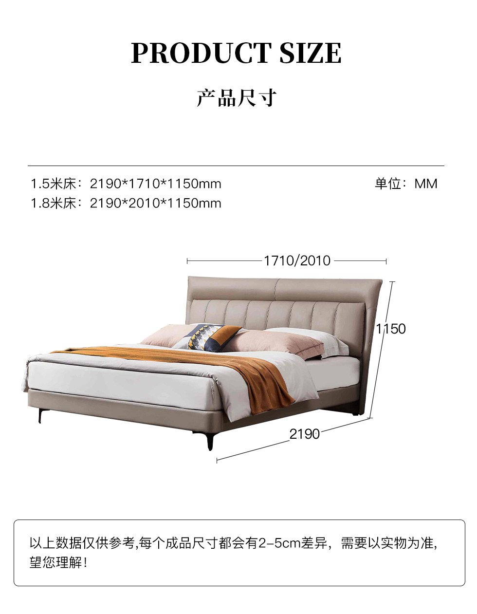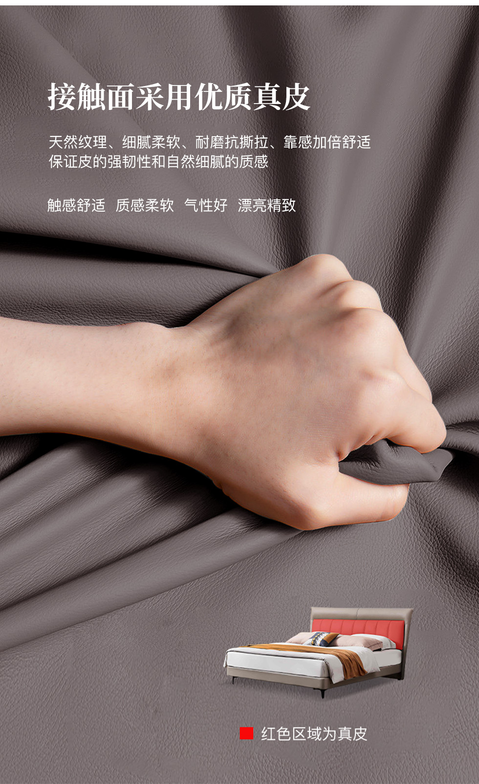 B系优选 现代简约 接触面头层牛皮+仿皮+高回弹海绵+实木框架+10分钢木排骨架+白蜡木床边 1.8米床B系优选 现代简约 布艺+高密度海绵+实木框架+钢木排骨架+碳素钢金属脚 1.8米软床(价格不含高箱,如需定制请咨询客服)