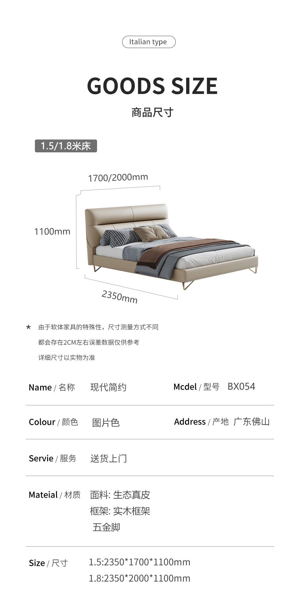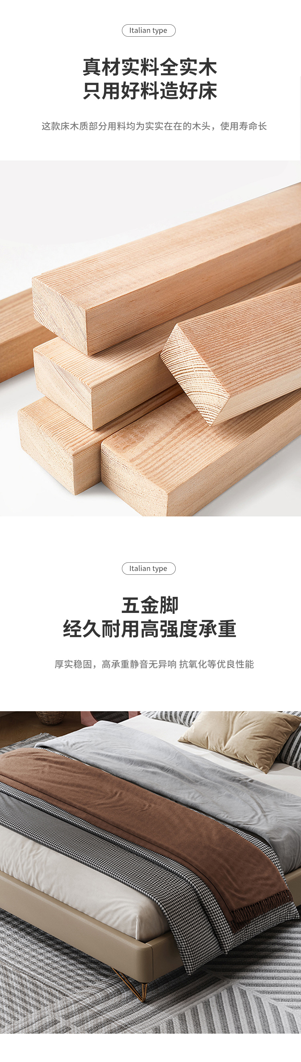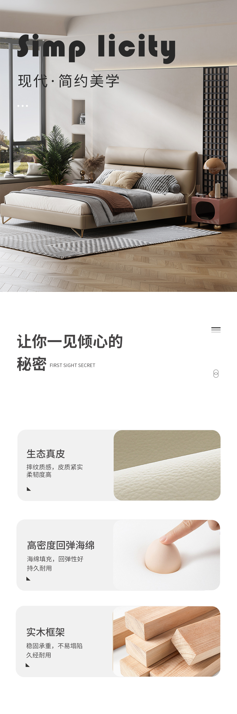 Minttu明途 极简 实木框架+海绵+靠包羽绒+生态真皮+仿皮+五金脚 皮床 1.8米