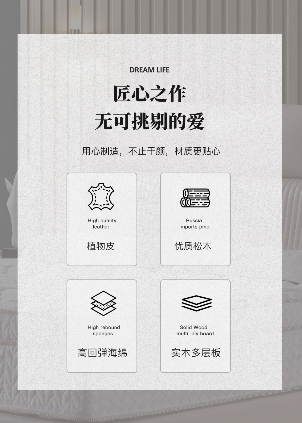e家优选 极简 植物皮 松木 实木多层板 高回弹海绵 银灰色 1.8米皮床