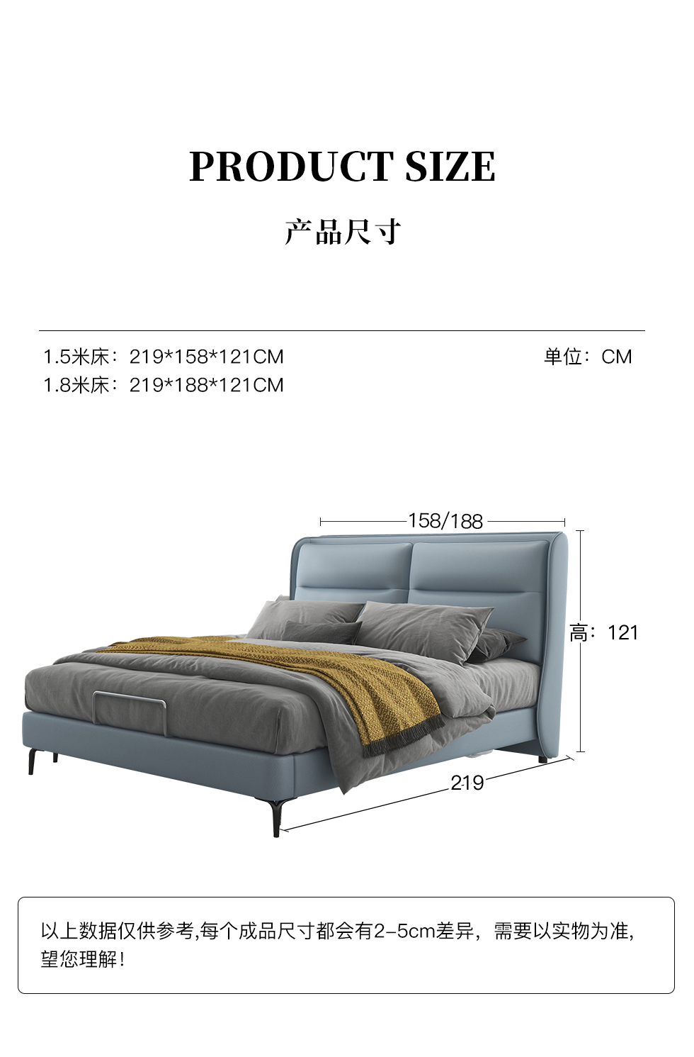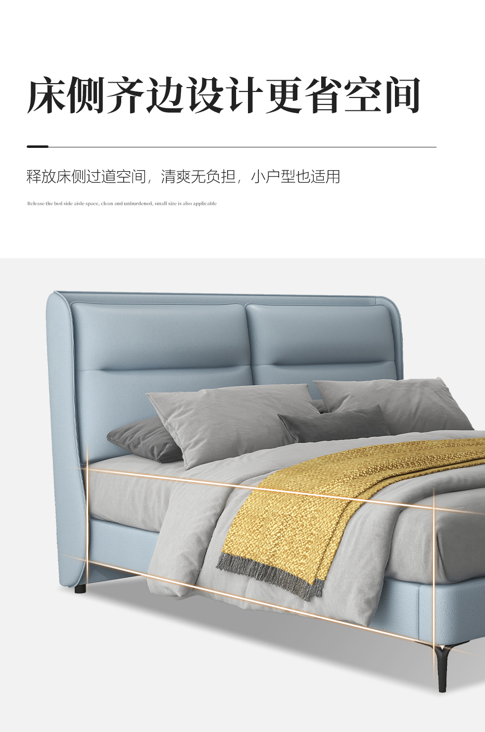 e家优选 极简 接触面头层牛皮 松木 实木多层板 高回弹海绵 银灰 加蓝色 1.8米皮床