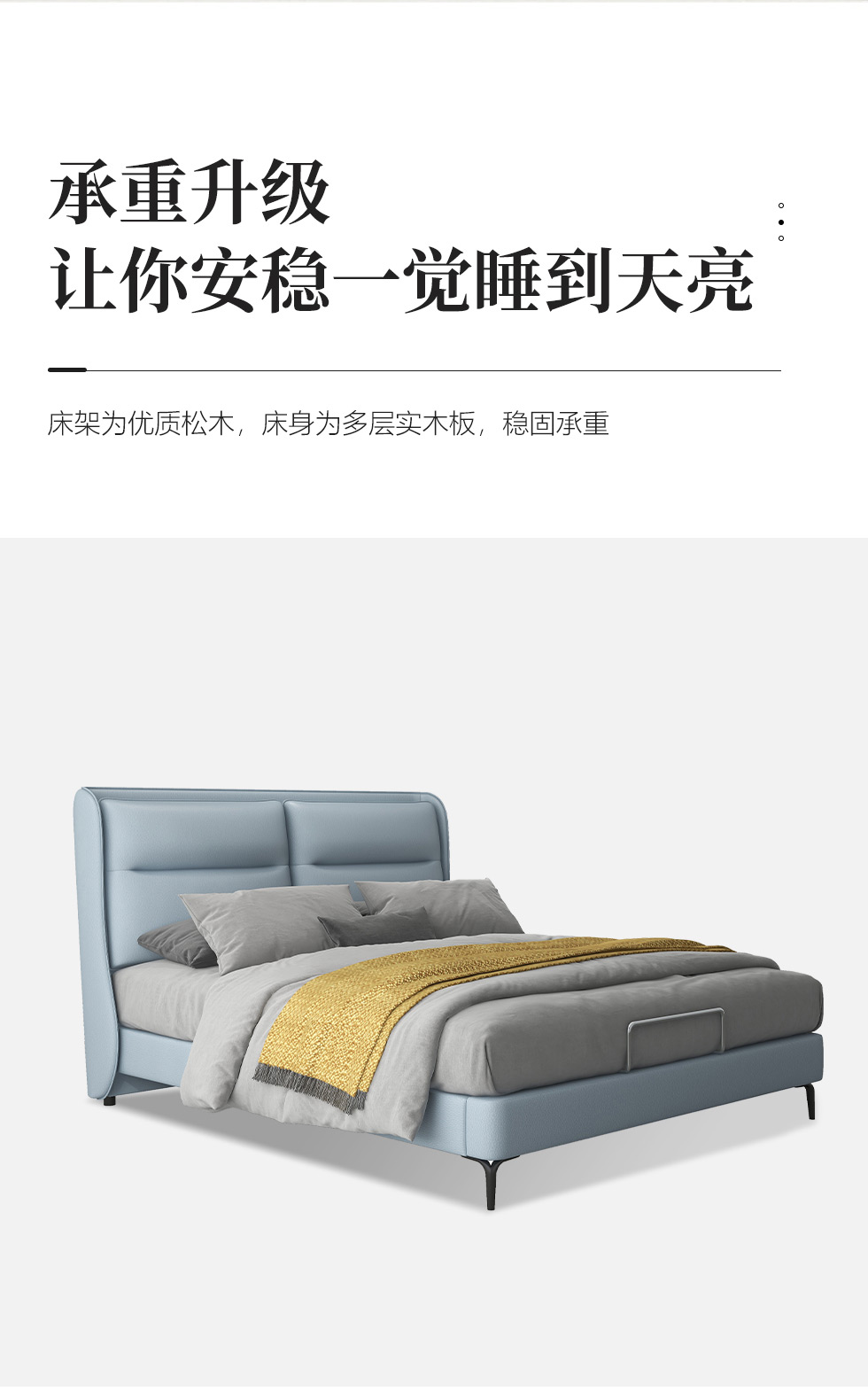 e家优选 极简 接触面头层牛皮 松木 实木多层板 高回弹海绵 银灰 加蓝色 1.8米皮床