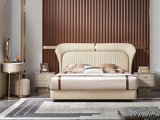 拜洛迪 轻奢 接触面真皮+拉丝香槟金不锈钢+实木排骨架+三边齐边 灰米黄色 1.8米床¥7831