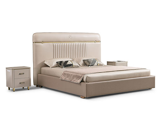 拜洛迪 轻奢 接触面真皮+五金拉丝香槟金不锈钢+床边实木+实木静音排骨架 米色 1.8米床