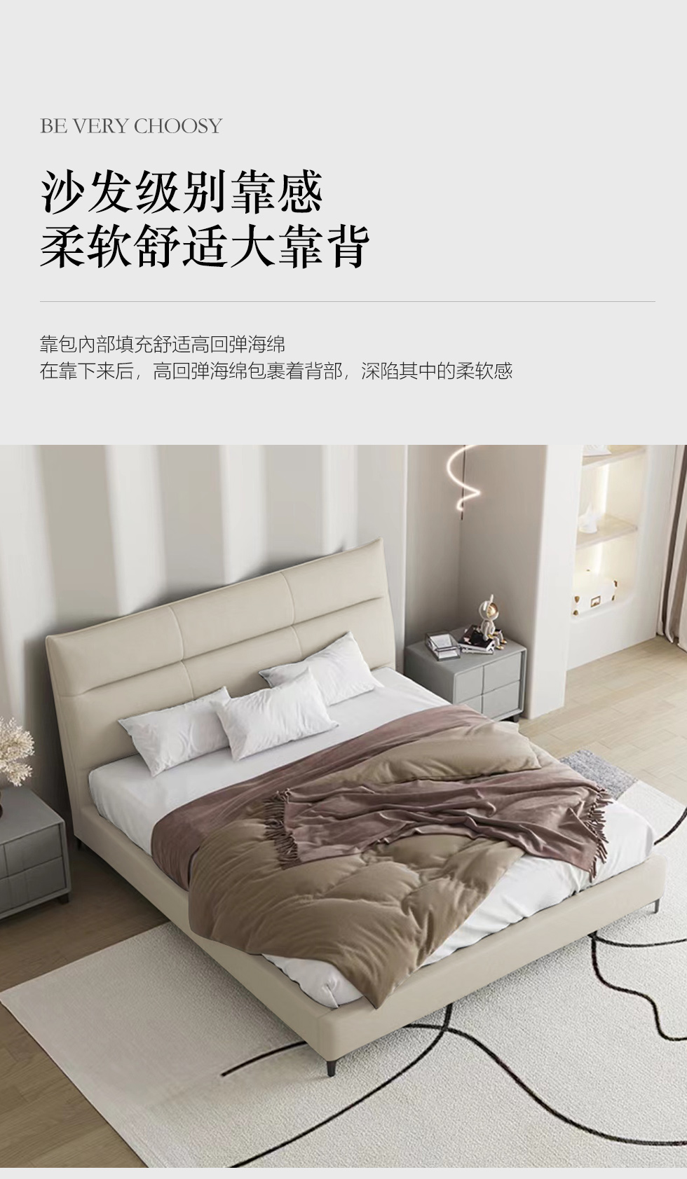 B系优选 现代简约 接触面真皮+仿皮+木框架高密 度回弹海绵+静音防滑实木十分排骨条+静音条 1.5米 真皮软床(价格不含高箱,如需定制请咨询客服)