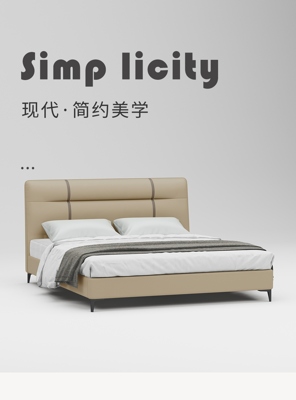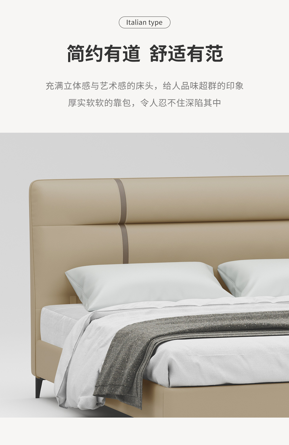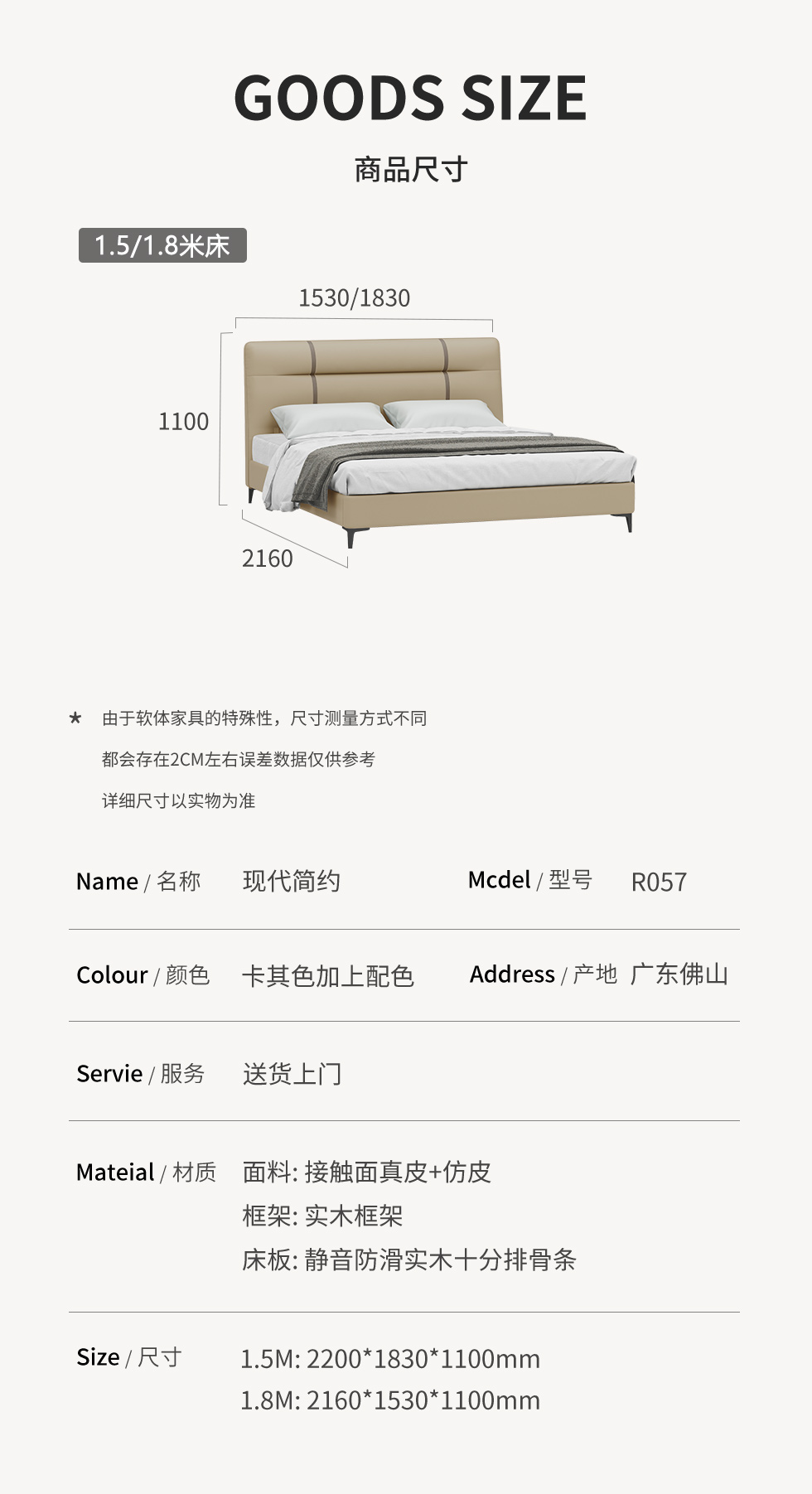B系优选 现代简约 接触面真皮+仿皮+木框架高密 度回弹海绵+静音防滑实木十分排骨条+五金脚+静音条 卡其色加上配色 1.8米 真皮软床(价格不含高箱,如需定制请咨询客服) |