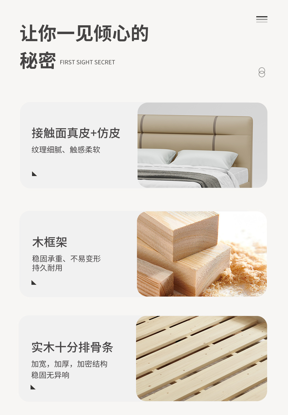 B系优选 现代简约 接触面真皮+仿皮+木框架高密 度回弹海绵+静音防滑实木十分排骨条+静音条 1.5米 真皮软床(价格不含高箱,如需定制请咨询客服)