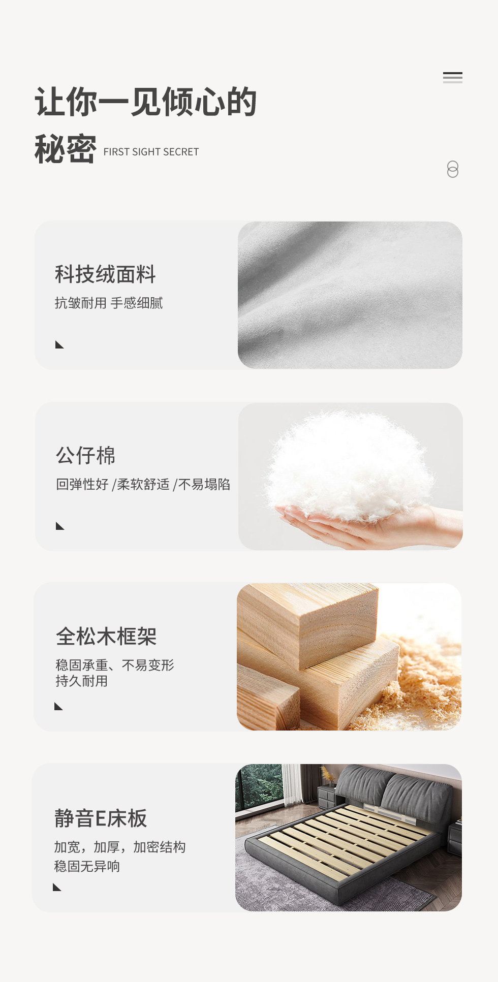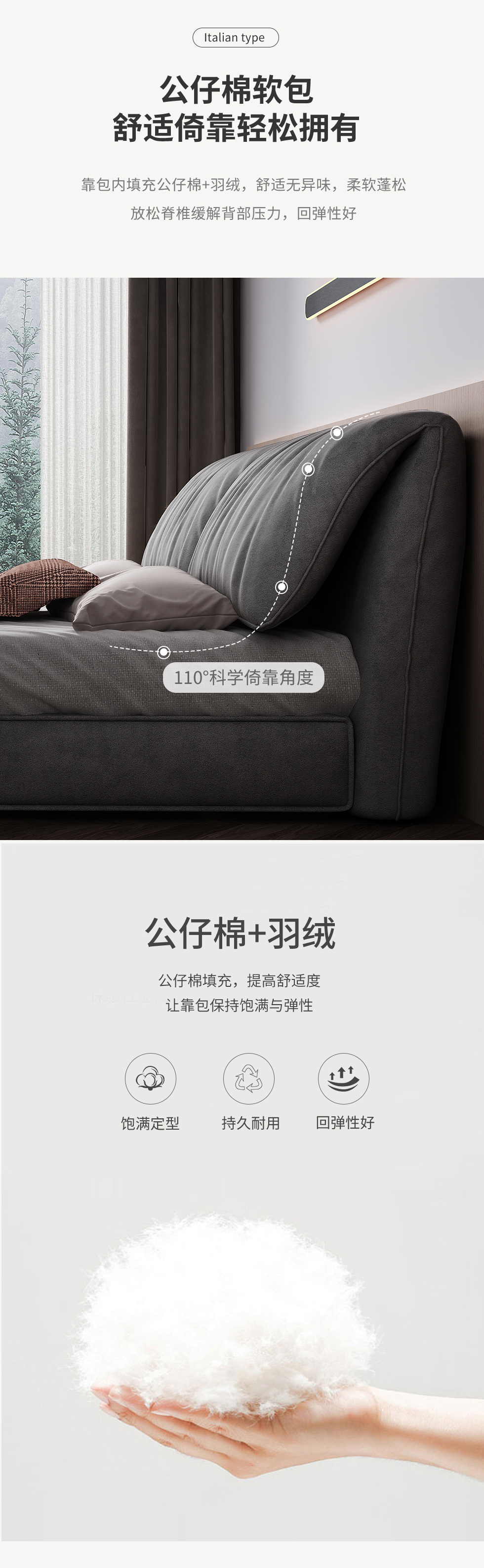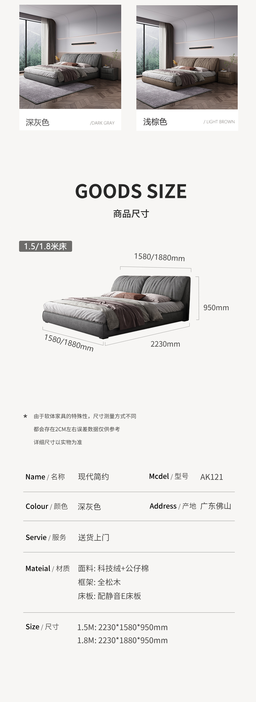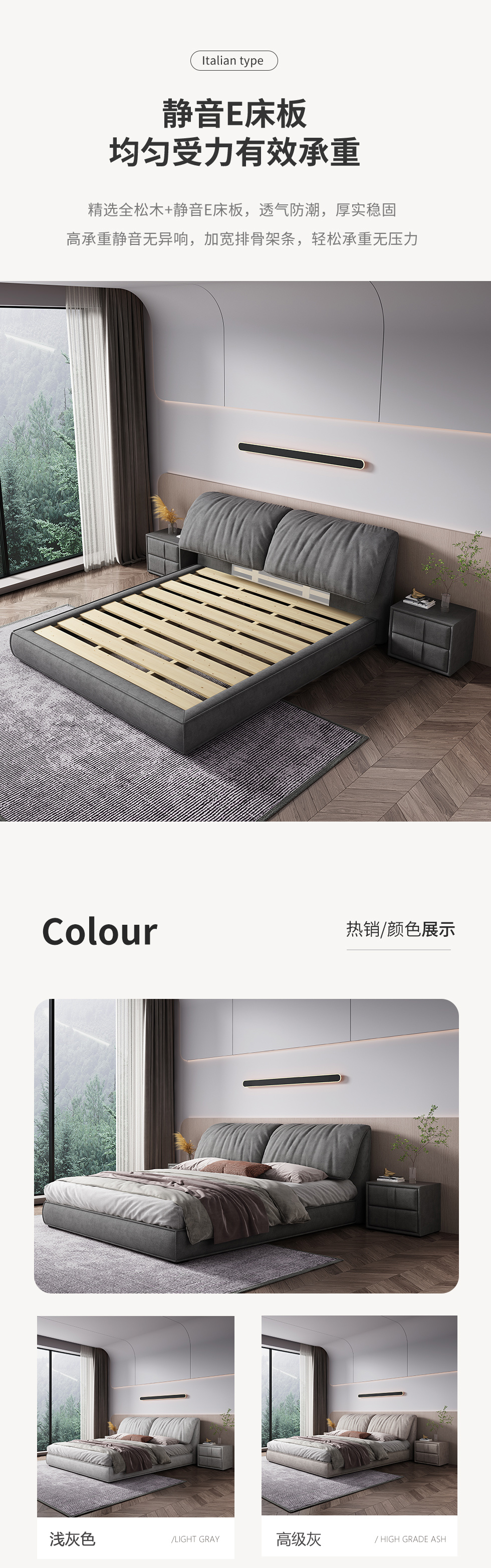 【套餐待优化】A系优选 现代简约 科技绒 靠包填充:公仔棉+羽绒 框架:全松木 标配床板:配静音E床板 1.8米床(价格不含高箱,如需定制请咨询客服) |
