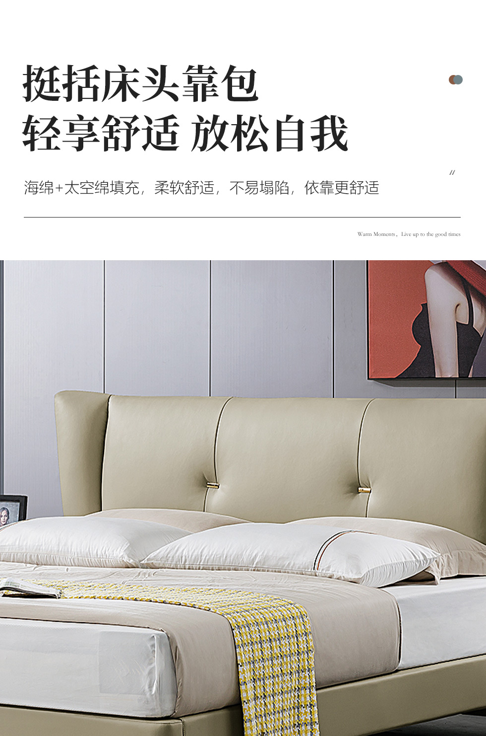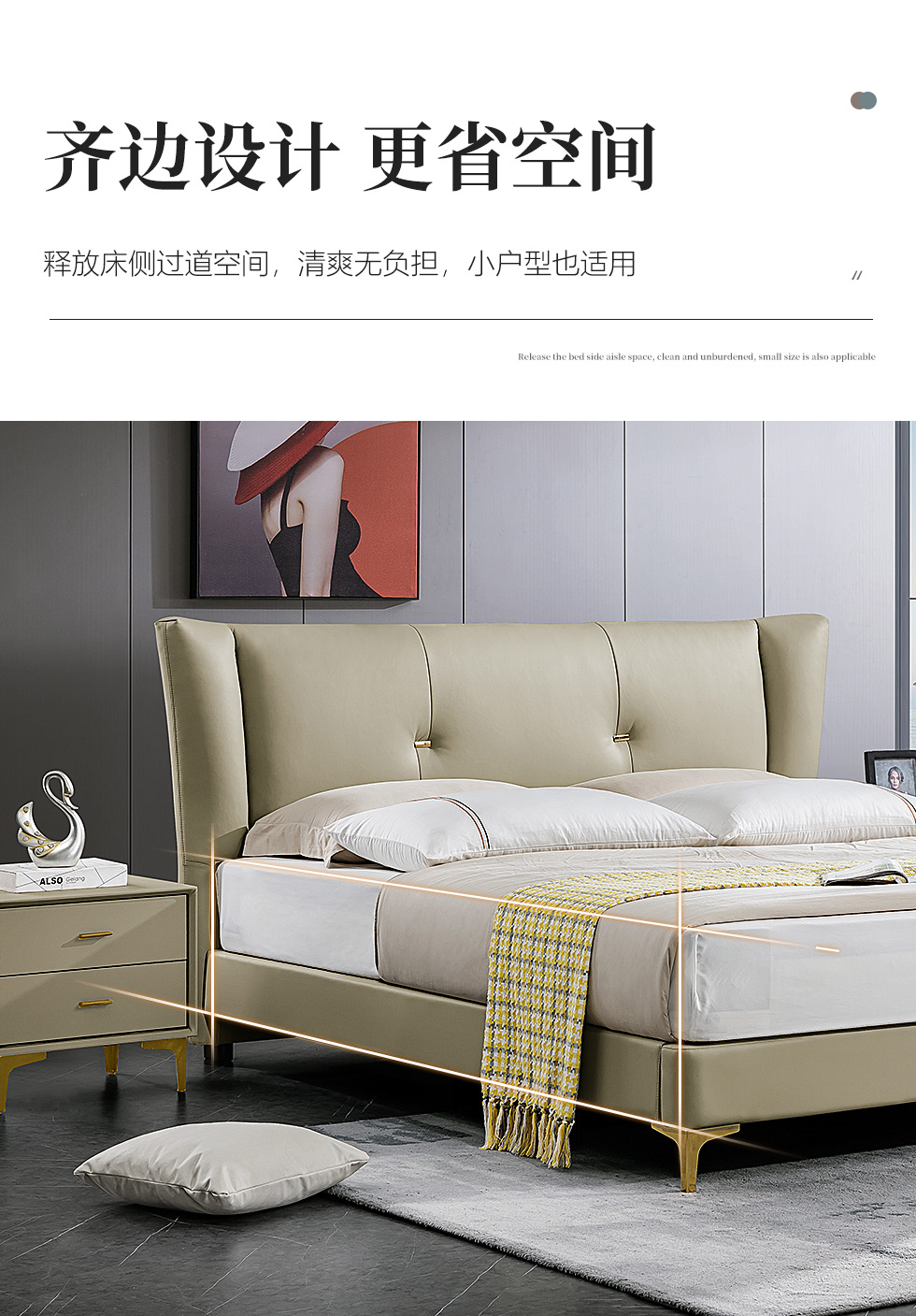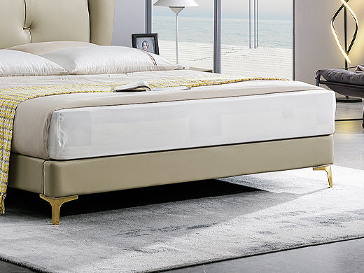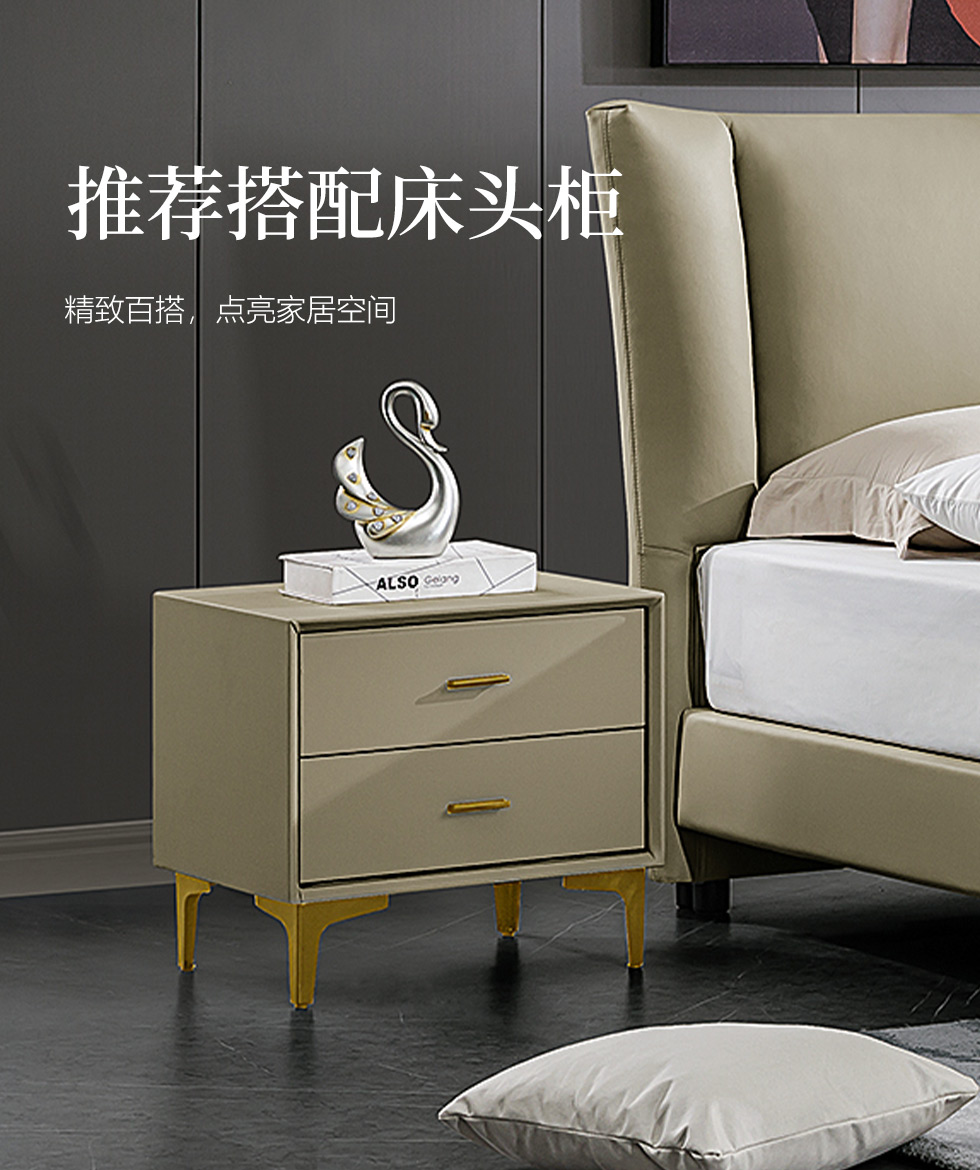 B系优选 轻奢 接触面进口头层牛皮+PVC 十公分钢木排骨架+进口实木 1.8米床+两个床头柜(价格不含高箱,如需定制请咨询客服)