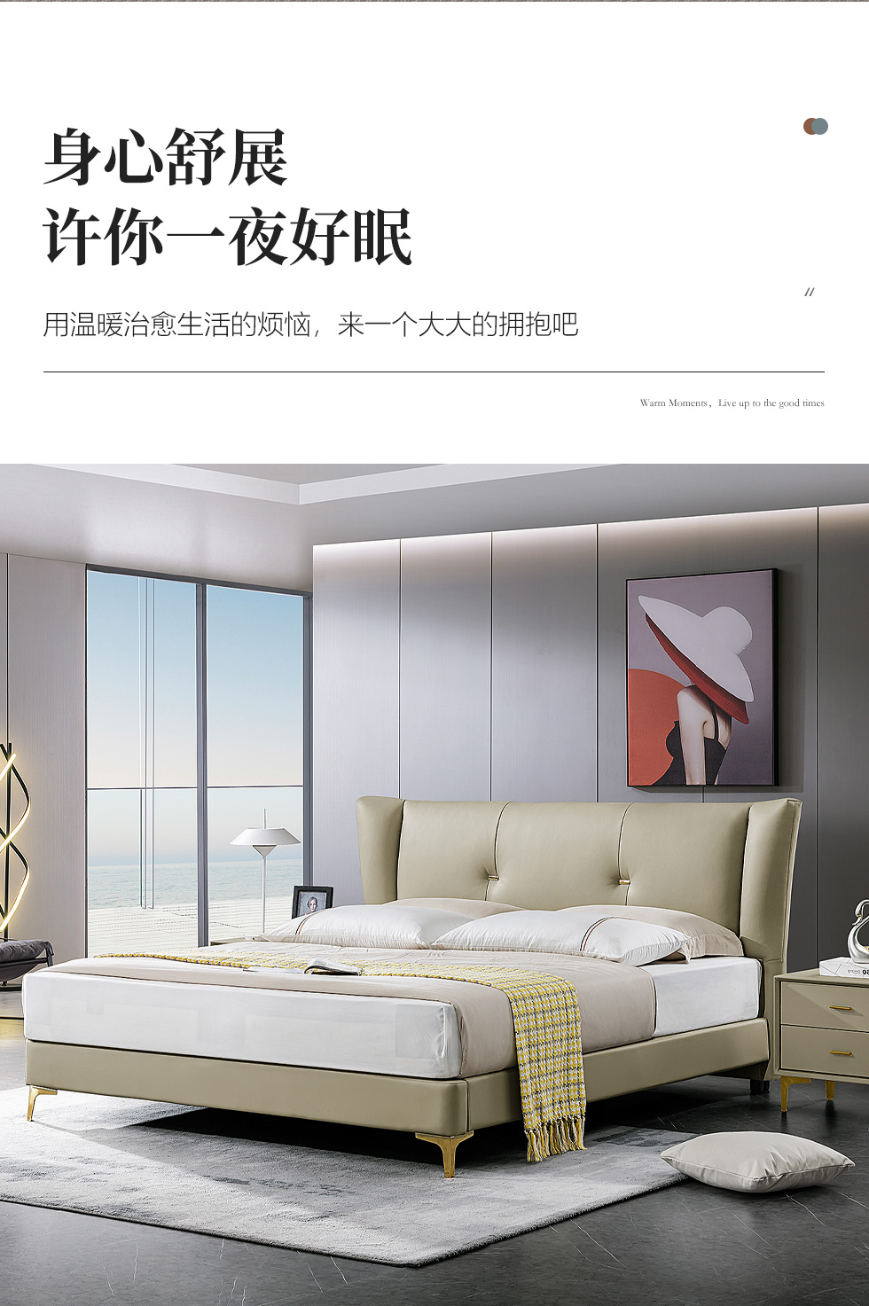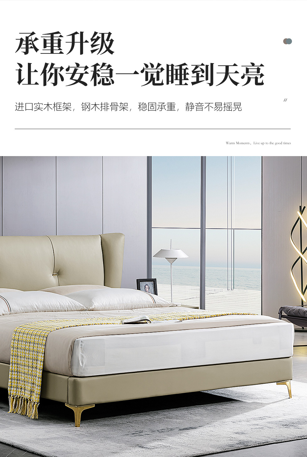 拉斐尔 轻奢 多层实木板+接触面头层牛皮+仿真皮+实木内架+碳素钢五金+钢木排骨架 1.8米床¥9432