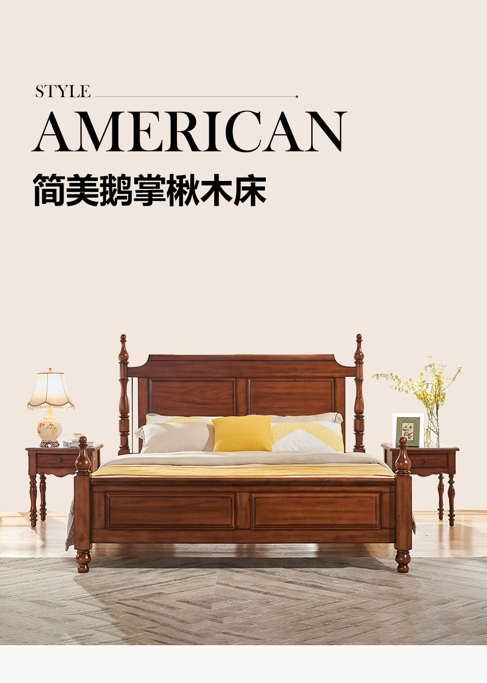 多纳宝 美式 美式 鹅掌楸木+脚柱橡胶木 1.8米床¥7785