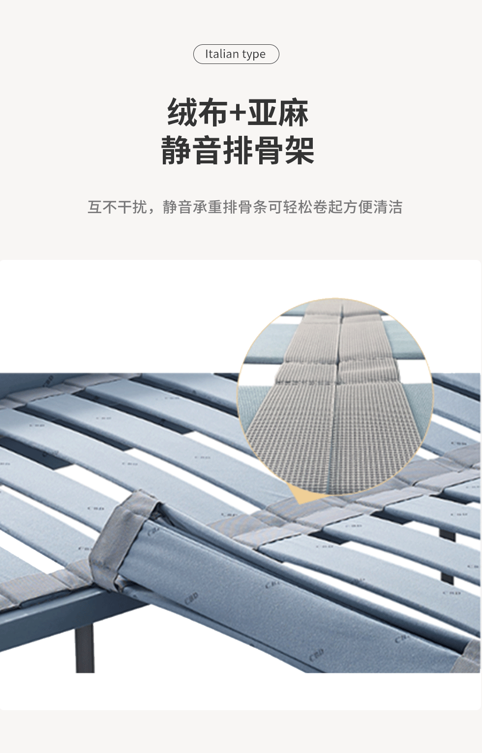 CBD家居 极简 优质纳纤皮+东亚海绵+云杉木实木主框架+分体卷帘式排骨条 HE07浅绛色 1.8米床架 |