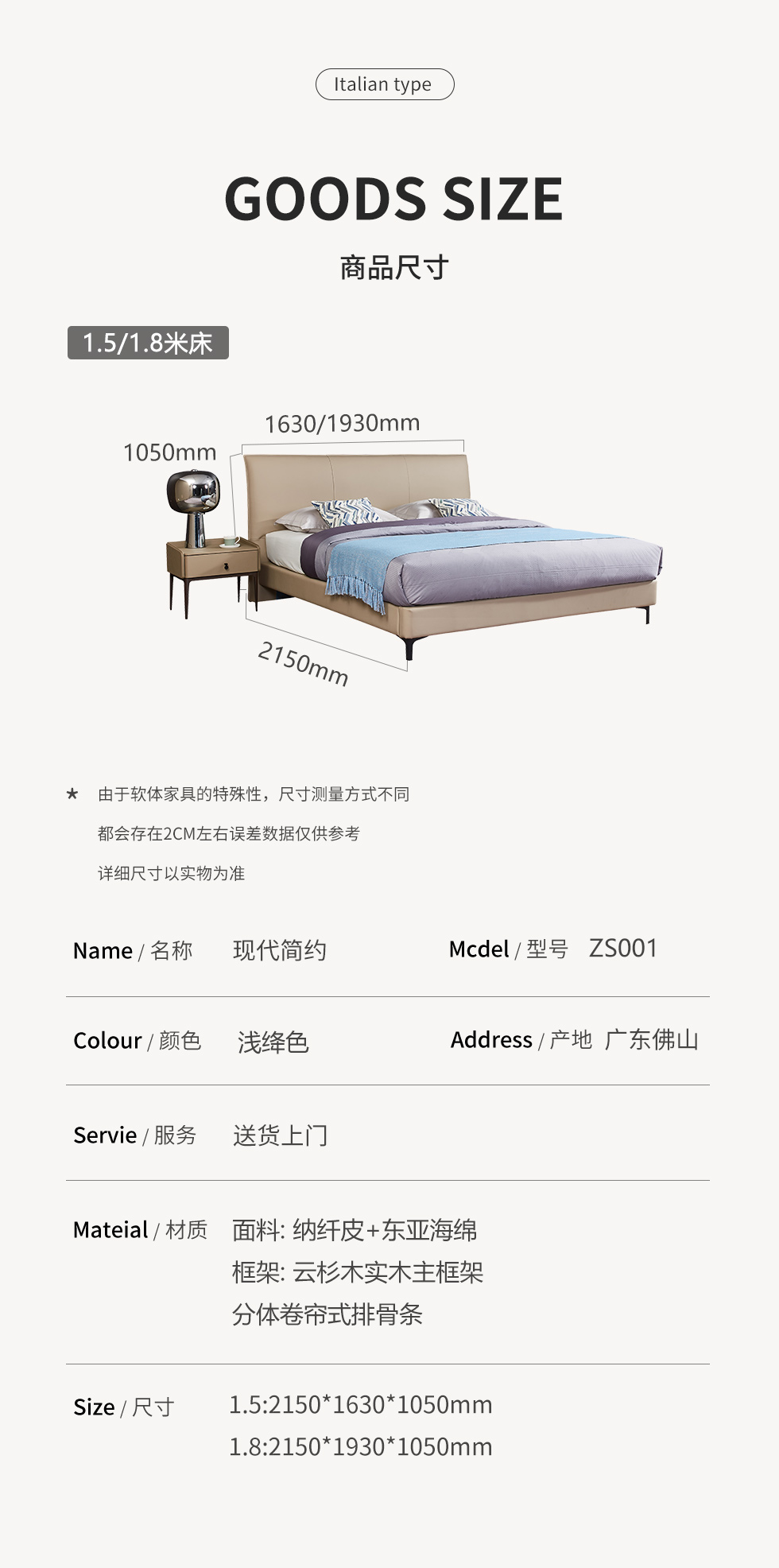 CBD家居 极简 优质纳纤皮+东亚海绵+云杉木实木主框架+分体卷帘式排骨条 HE07浅绛色 1.5米床架 |