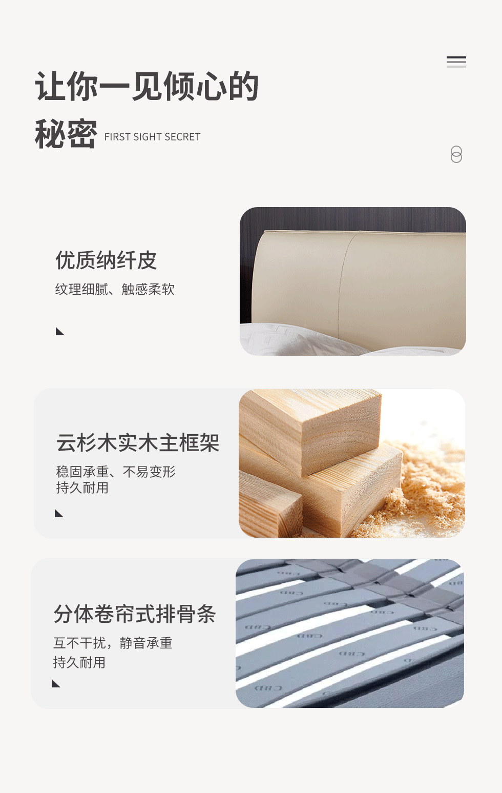 CBD家居 极简 床头接触面HE07+/HE02纳纤皮+其他HE07纳纤皮+东亚海绵+云杉木实木主框架+分体卷帘式排骨条 HE07浅绛色/HE02蜡白 1.5米床架