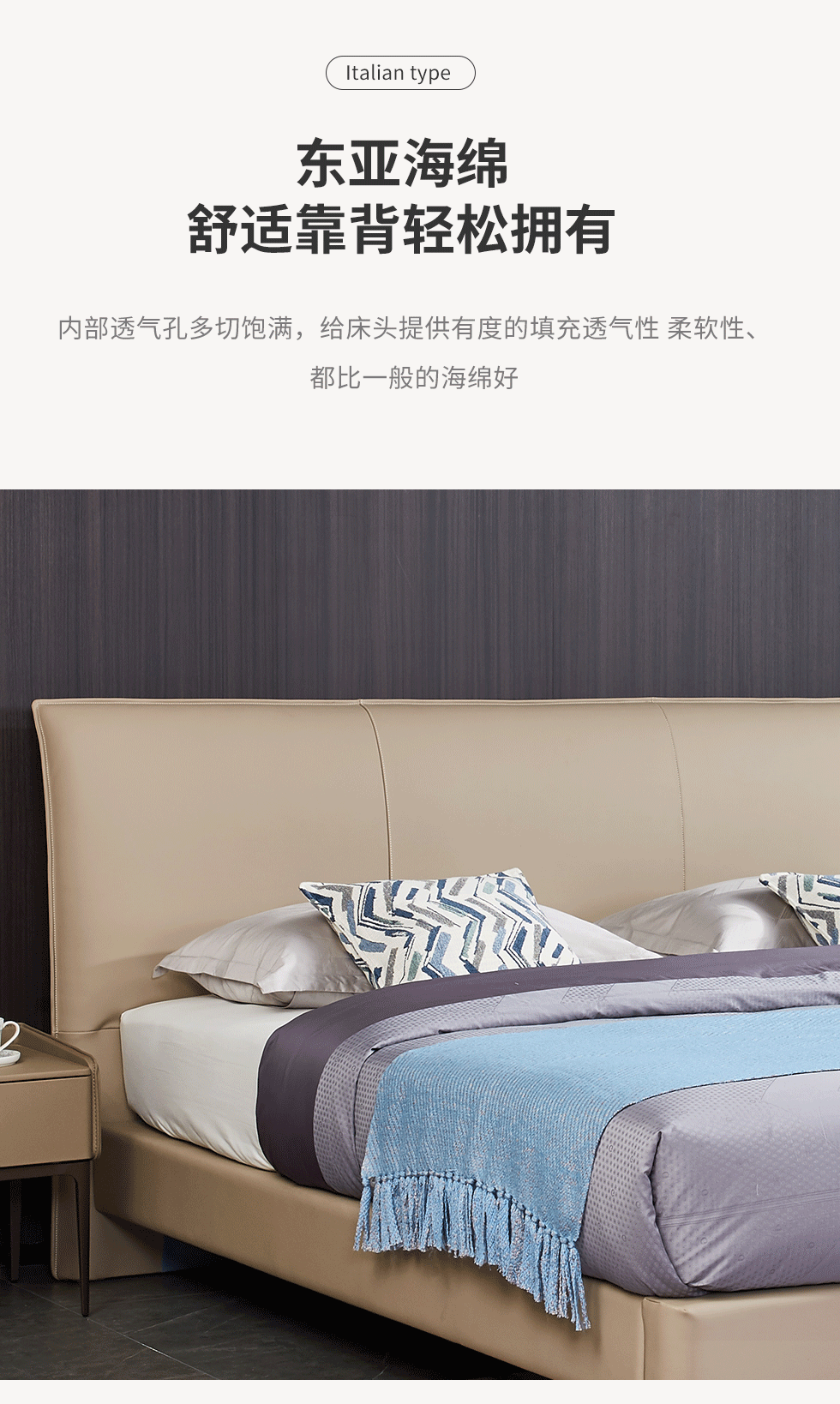 CBD家居 极简 床头接触面HE07+/HE02纳纤皮+其他HE07纳纤皮+东亚海绵+云杉木实木主框架+分体卷帘式排骨条 HE07浅绛色/HE02蜡白 1.8米床架