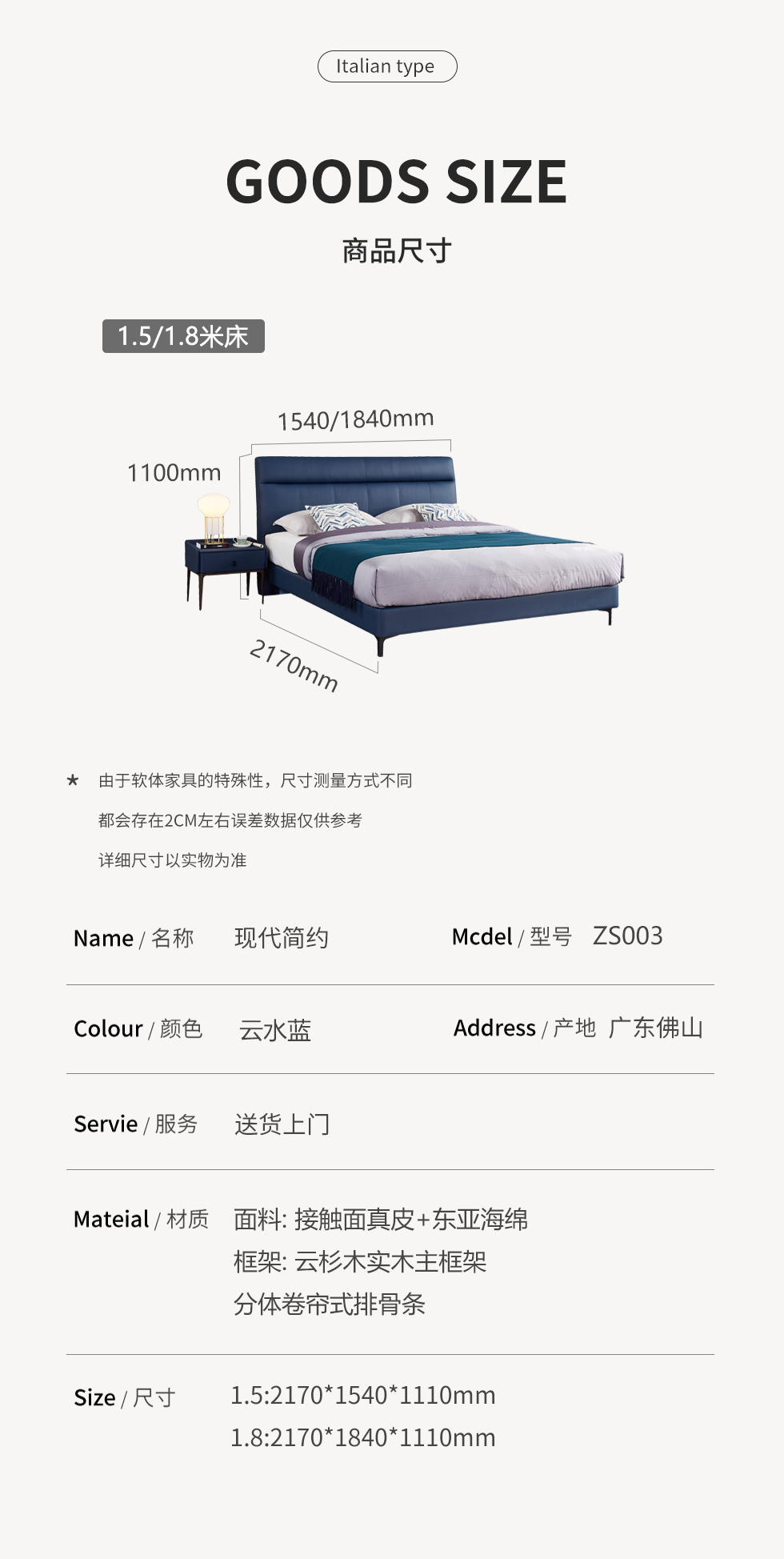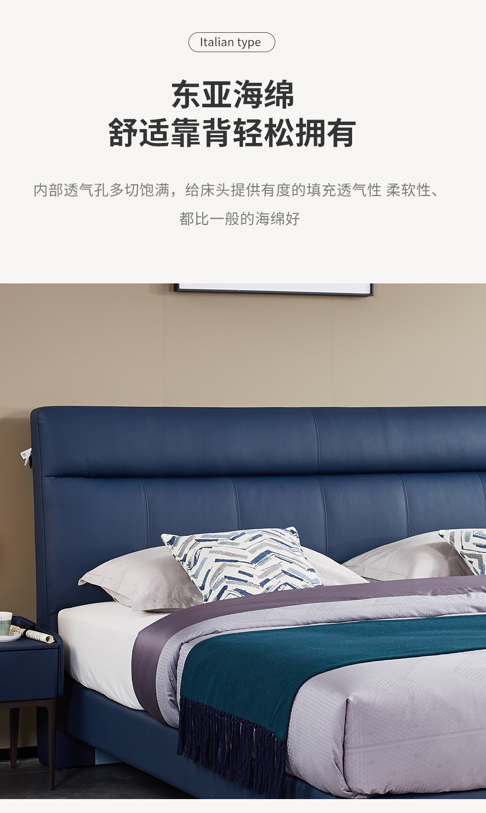 CBD家居 现代简约 接触面真皮+非接触面仿皮+东亚海绵+云杉木实木主框架+分体卷帘式排骨条 TE04云水蓝 1.5米床架