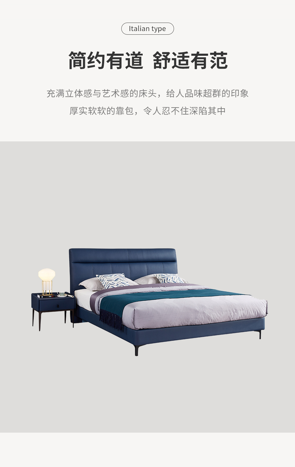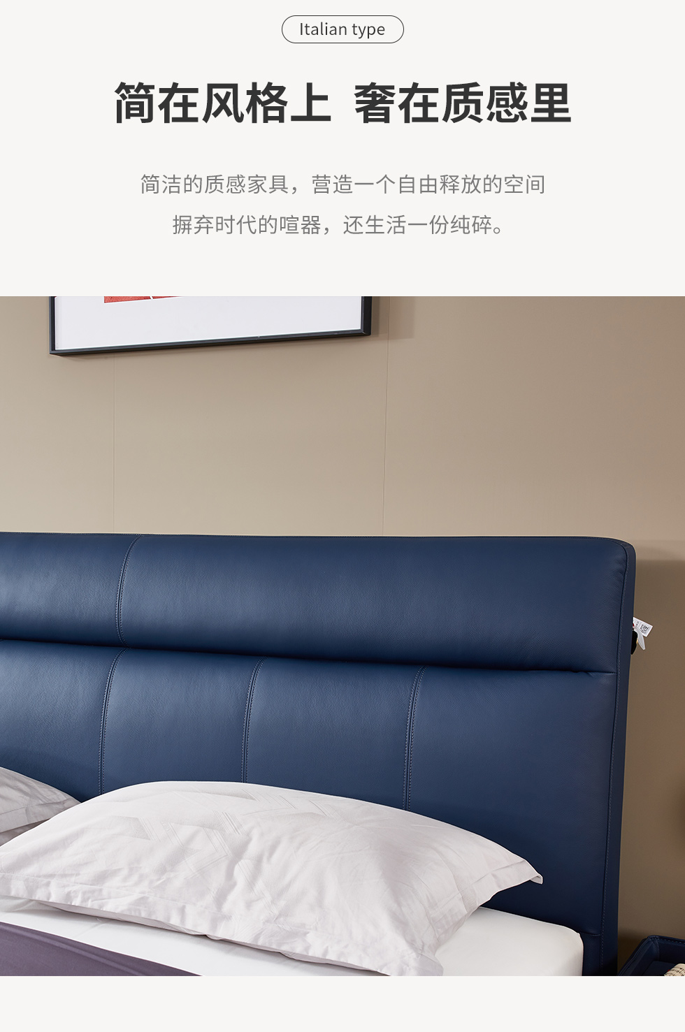 CBD家居 极简 接触面真皮+非接触面仿皮+东亚海绵+云杉木实木主框架+分体卷帘式排骨条 TE08鸽蓝 1.8米床架¥7903