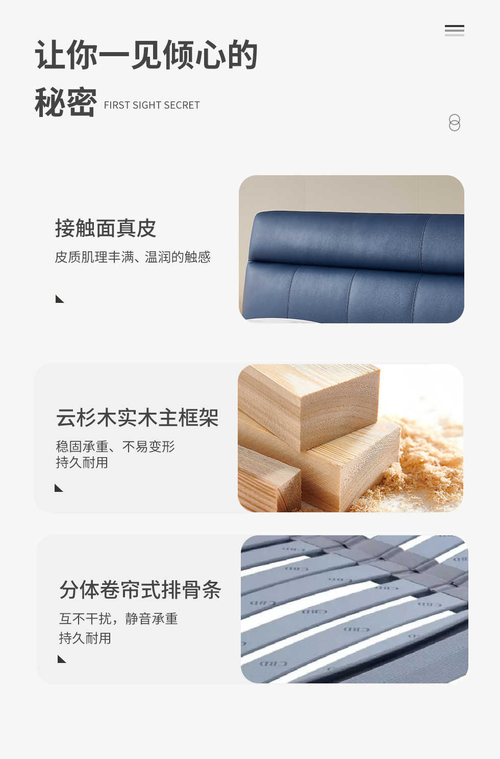 CBD家居 极简 接触面真皮+非接触面仿皮+东亚海绵+云杉木实木主框架+分体卷帘式排骨条 TE07天青色 1.8米床架¥7207