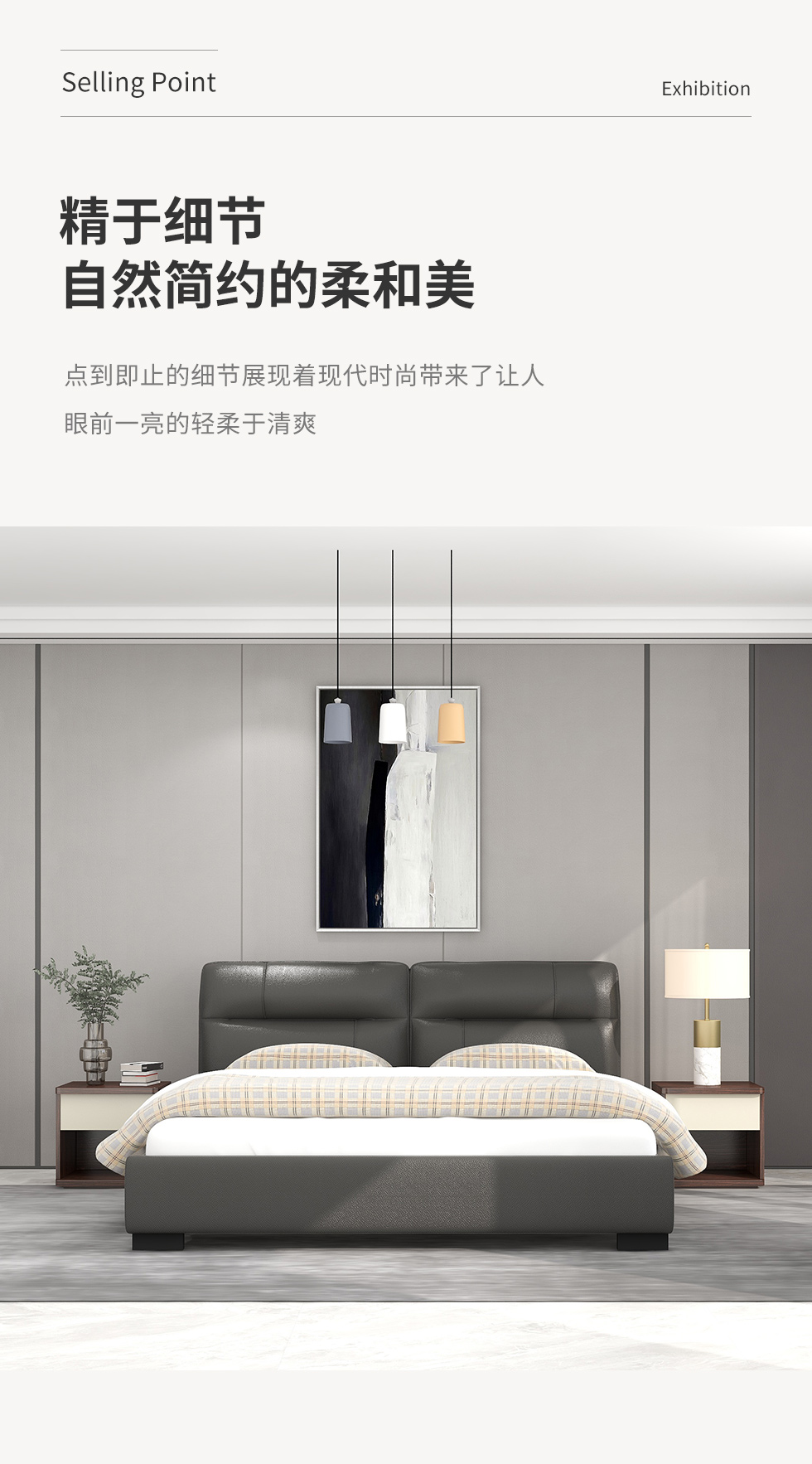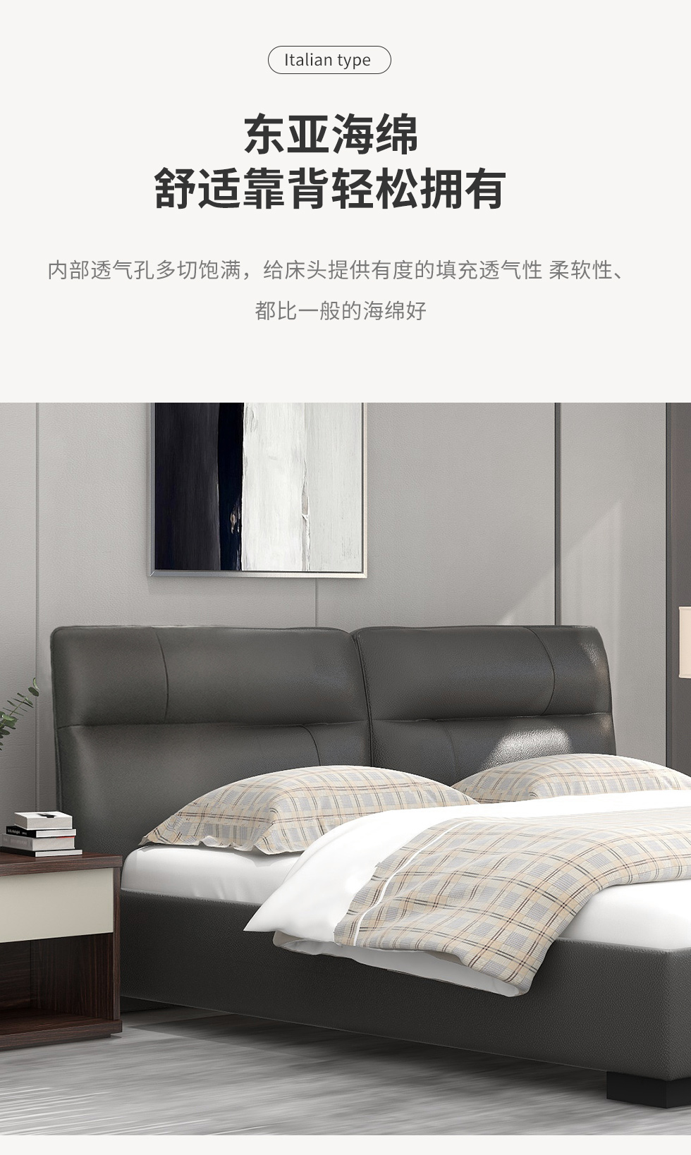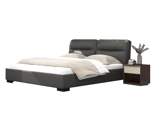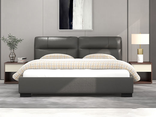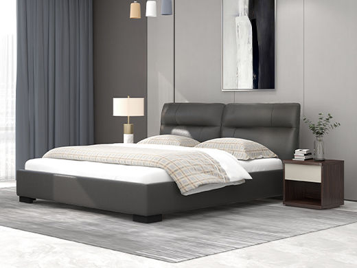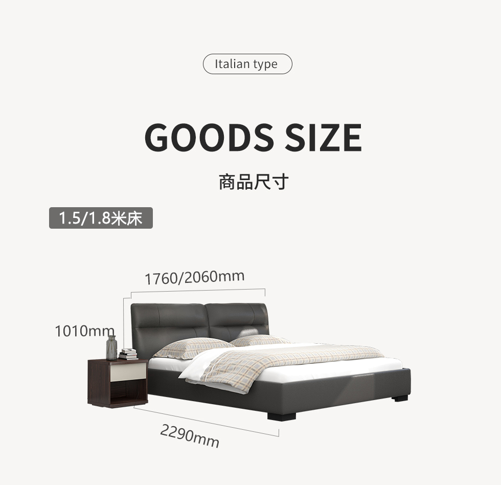 CBD家居 极简 接触面真皮+非接触面仿皮+东亚海绵+云杉木实木主框架+分体卷帘式排骨条 TE97镍灰 1.8米床架