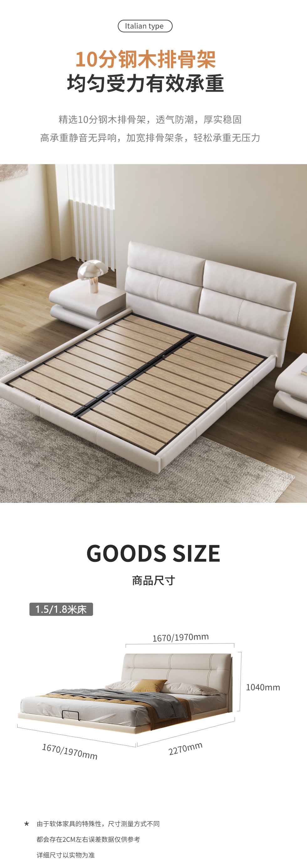云端 奶油风 超纤皮+钢木排骨架 米白色 网红云朵1.8米悬浮床