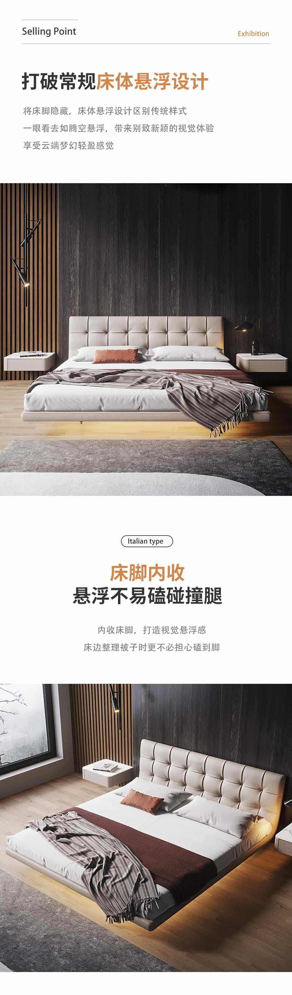 云端 奶油风 超纤皮+高回弹海绵 烟雾灰 1.8米悬浮床¥5499
