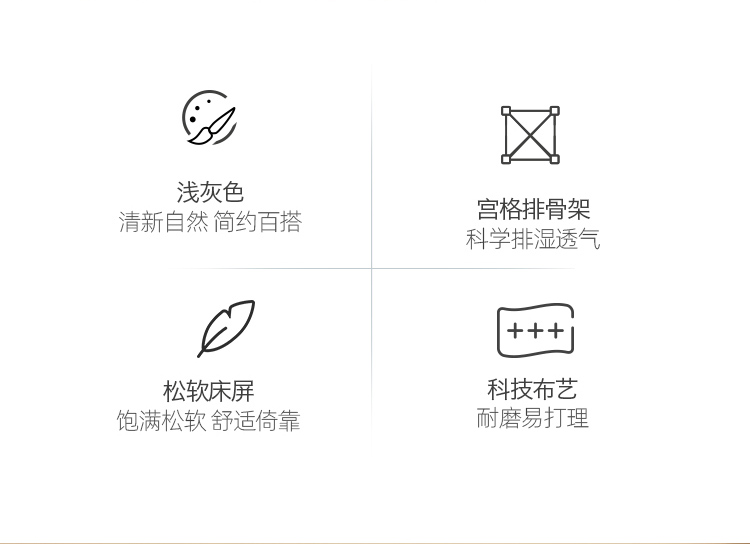 非凡工艺 现代简约 科技布+进口落叶松+多层实木板+高回弹海绵+碳素钢五金+10分钢木排骨架 浅灰色 1.8米床| 商品详情 | 规格参数 | 评价(0) | 购买咨询() | 产品实拍图 | 服务标准 |
