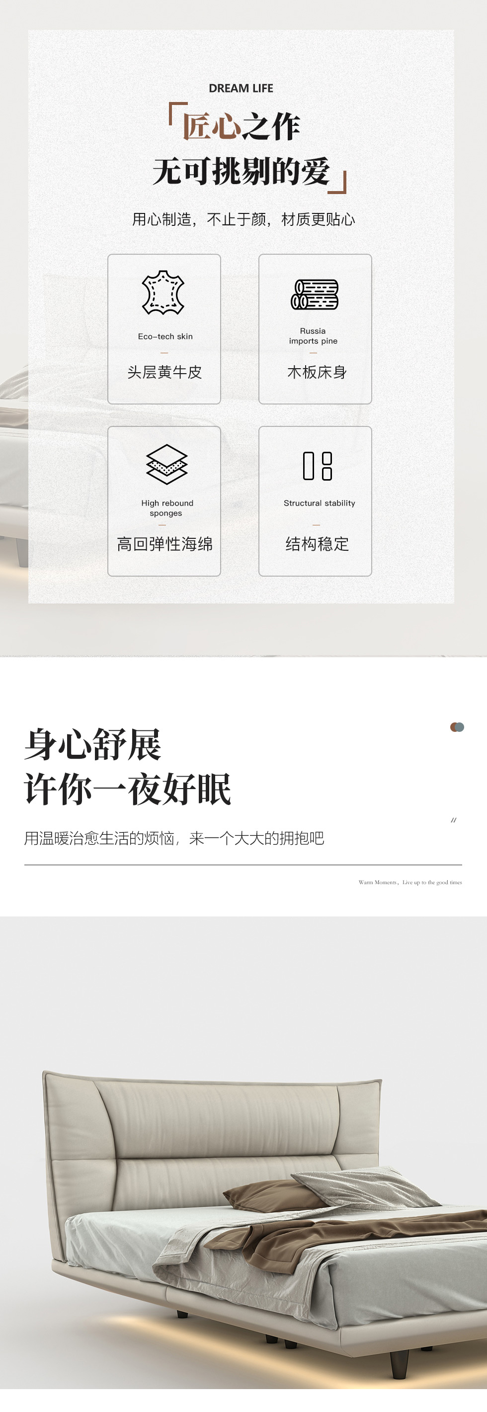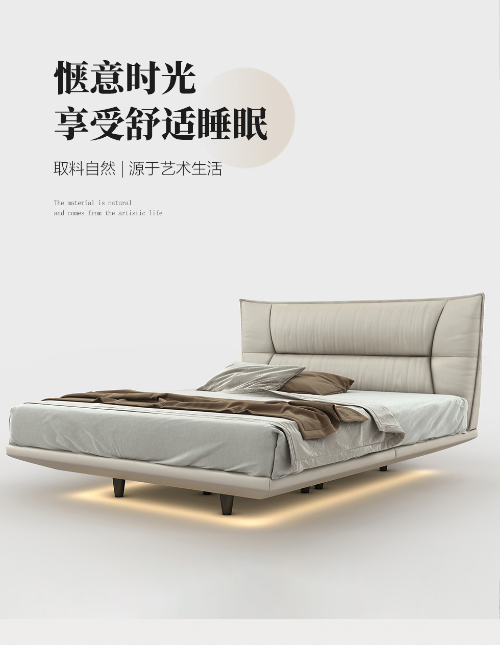 左右家居 极简 接触面头层黄牛皮+碳素钢脚+木板床身+高回弹性海绵填充 米白色 1.8米悬浮床 |