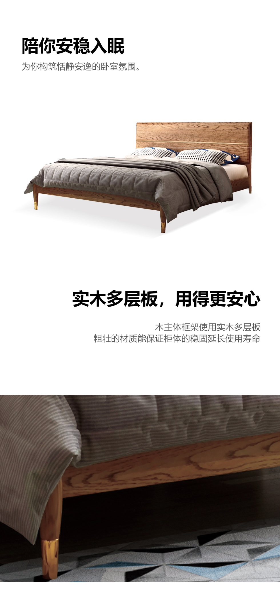 乐芙兰 北欧 进口白蜡木+多层实木板+松木床板 胡桃色 1.8米床