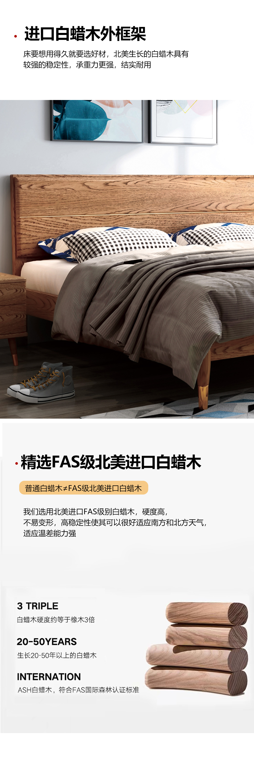 简森曼 北欧风 床头床尾脚为橡胶木 原木色 1.8米床 【实木拼接工艺】¥2190