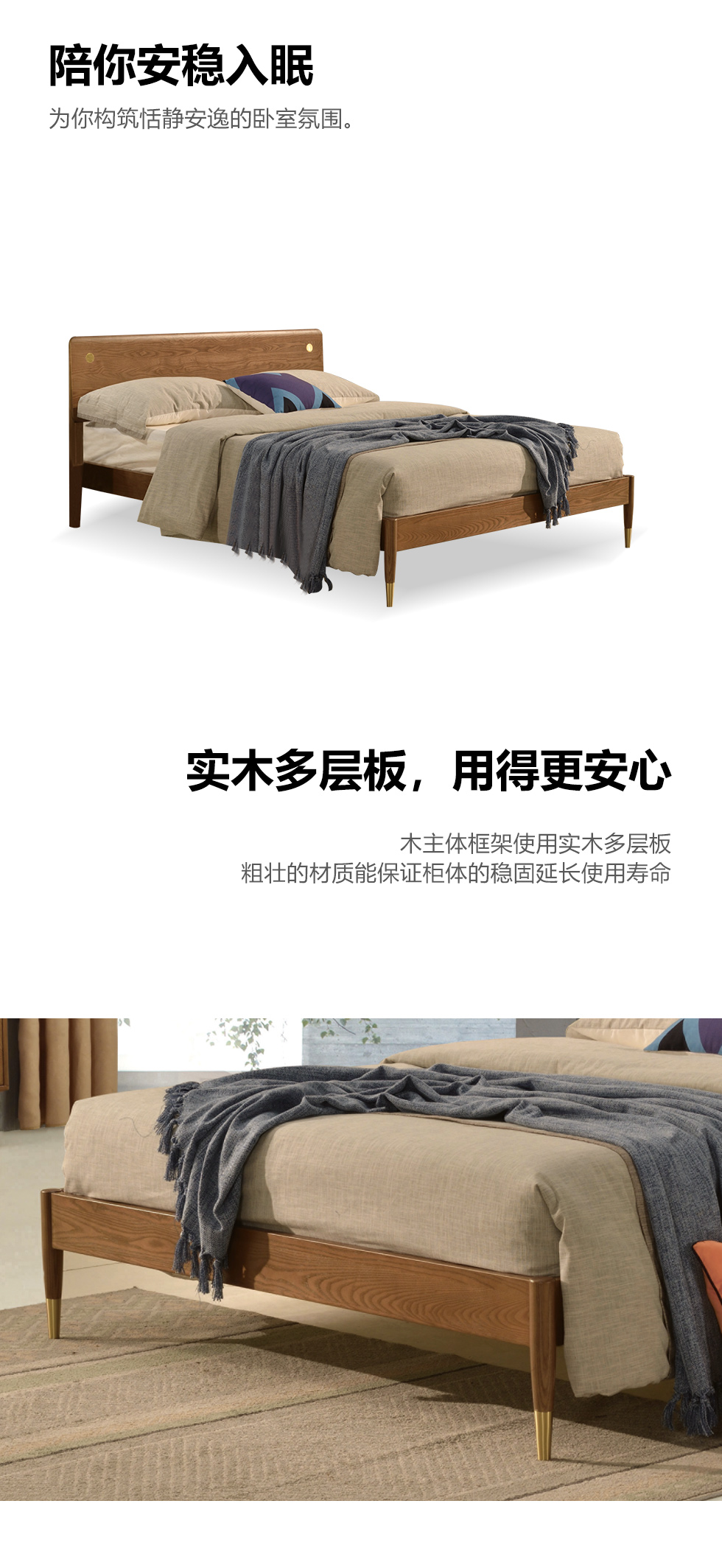 乐芙兰 北欧 进口白蜡木+多层实木板+松木床板 胡桃色 1.5米床