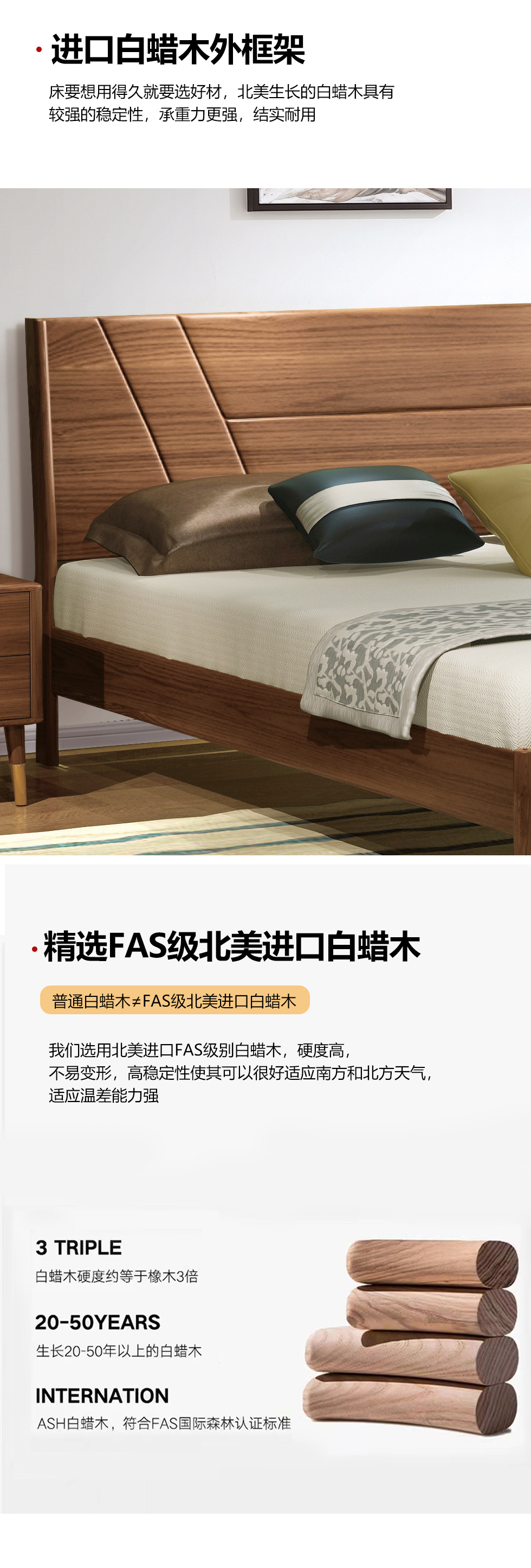 乐芙兰 北欧 进口白蜡木+多层实木板+超纤皮+高回弹海绵+松木床板 胡桃色 1.8米床