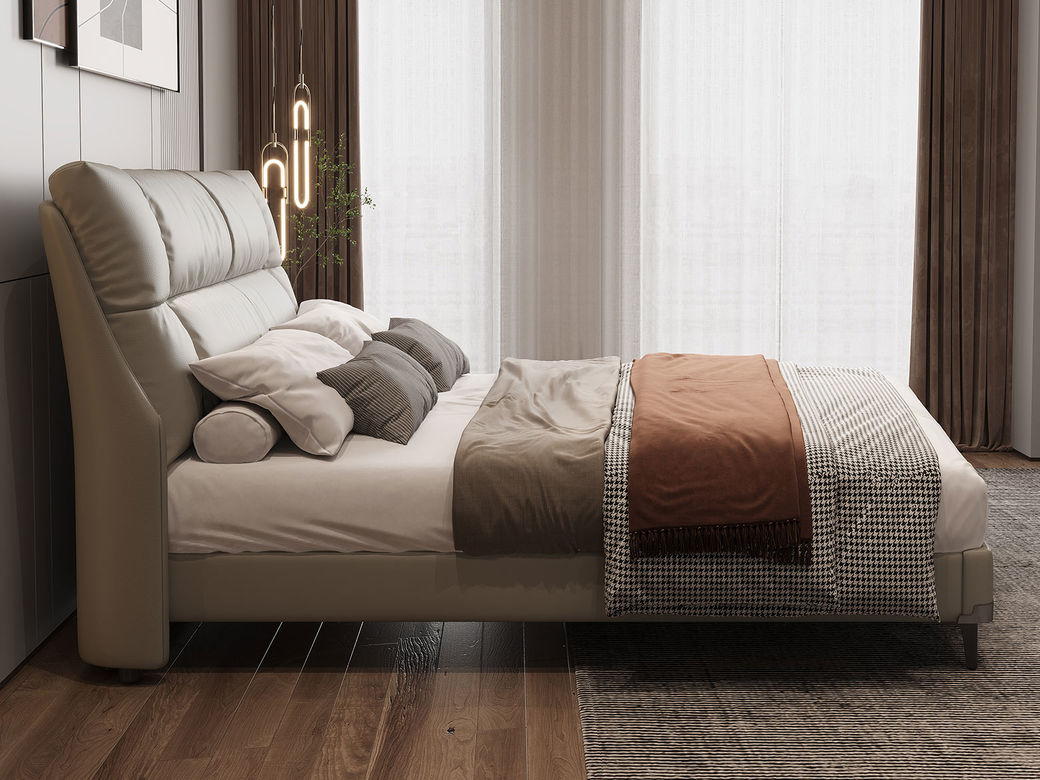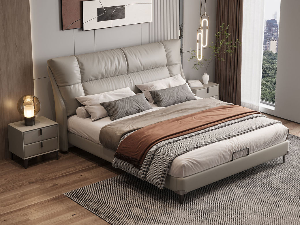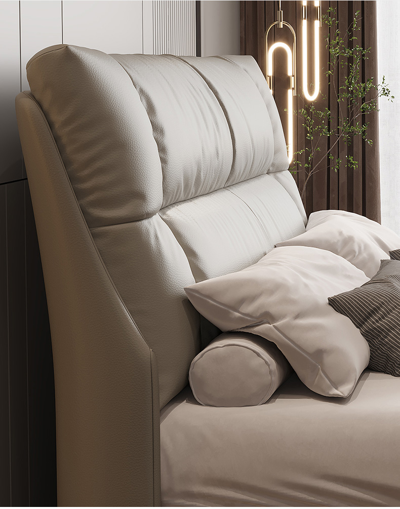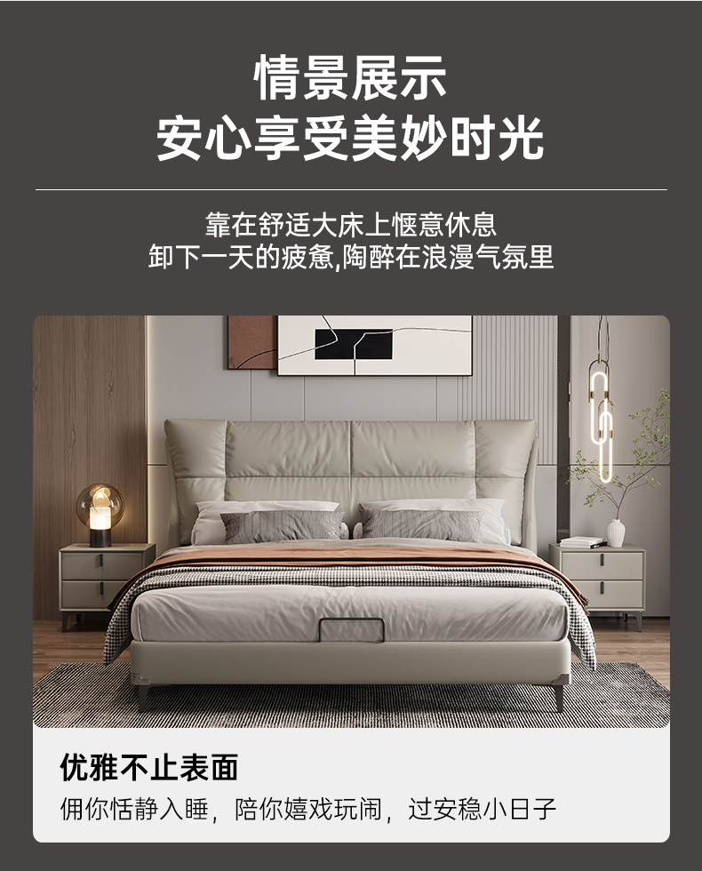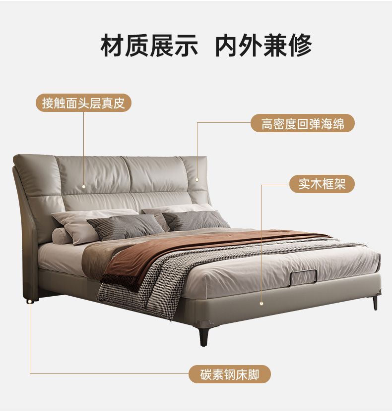 B系优选 现代简约 接触面真皮+仿皮+木框架高密 度回弹海绵+静音防滑实木十分排骨条+静音条 1.5米 真皮软床(价格不含高箱,如需定制请咨询客服)¥2819