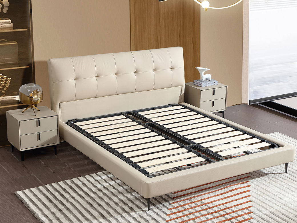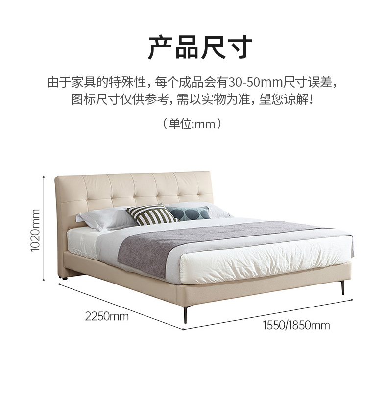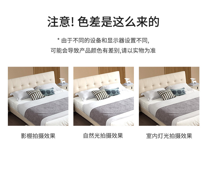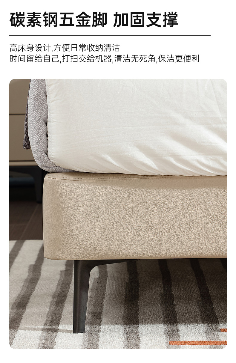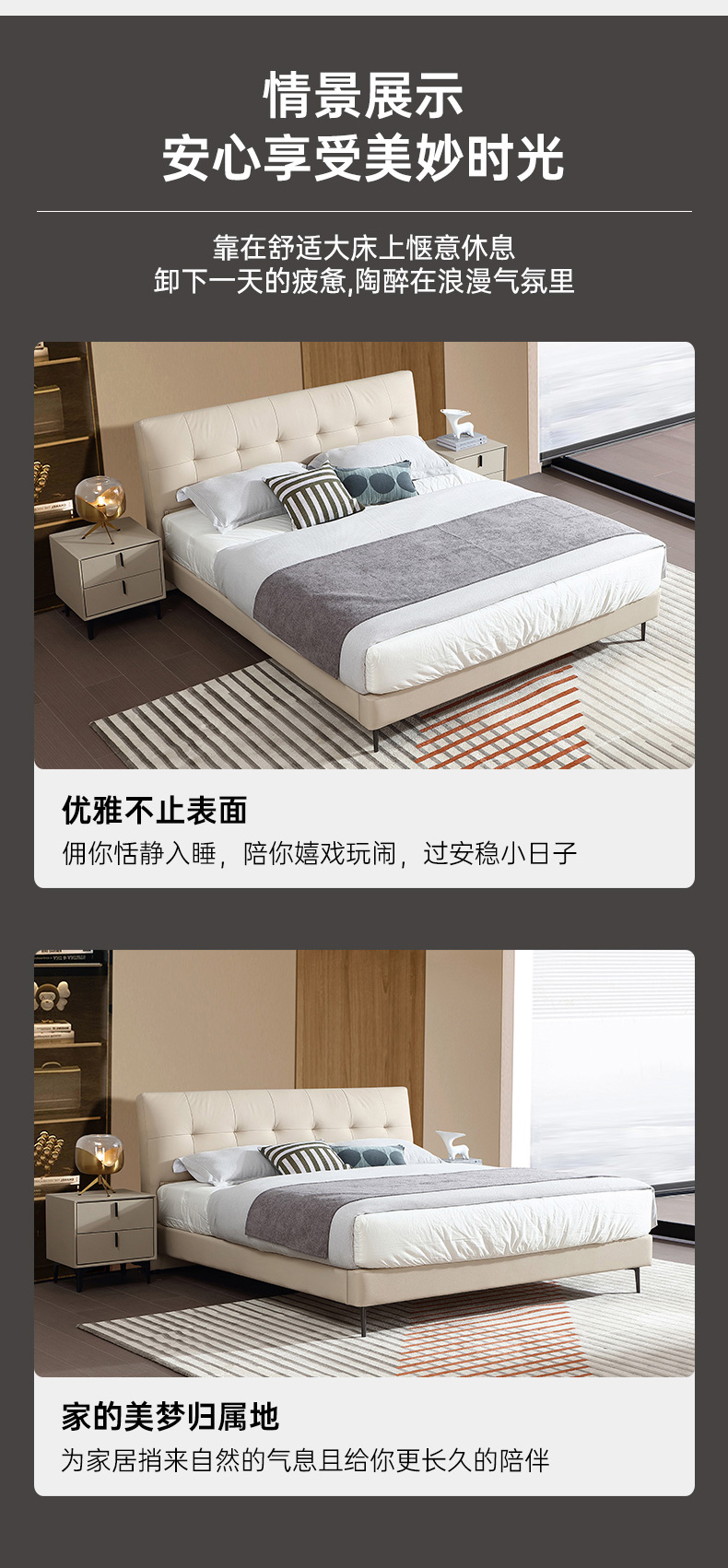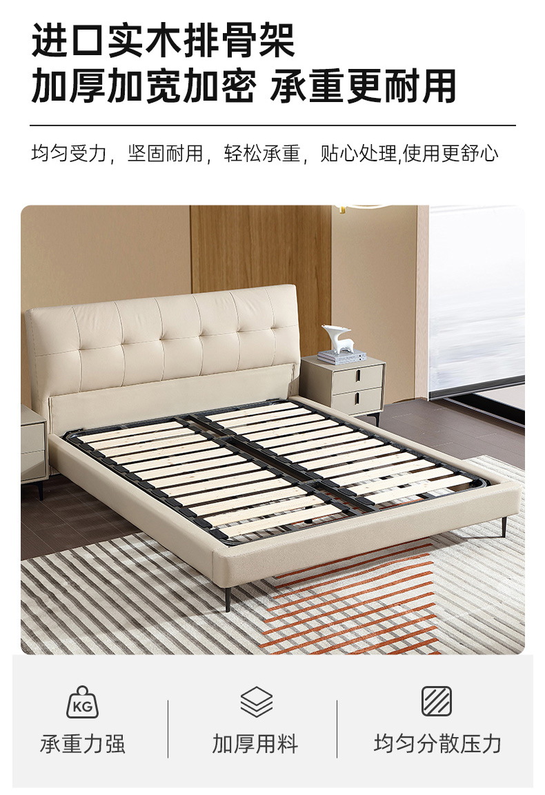 B系优选 现代简约 接触面真皮+仿皮+木框架高密 度回弹海绵+静音防滑实木十分排骨条+静音条 1.5米 真皮软床(价格不含高箱,如需定制请咨询客服)¥2819