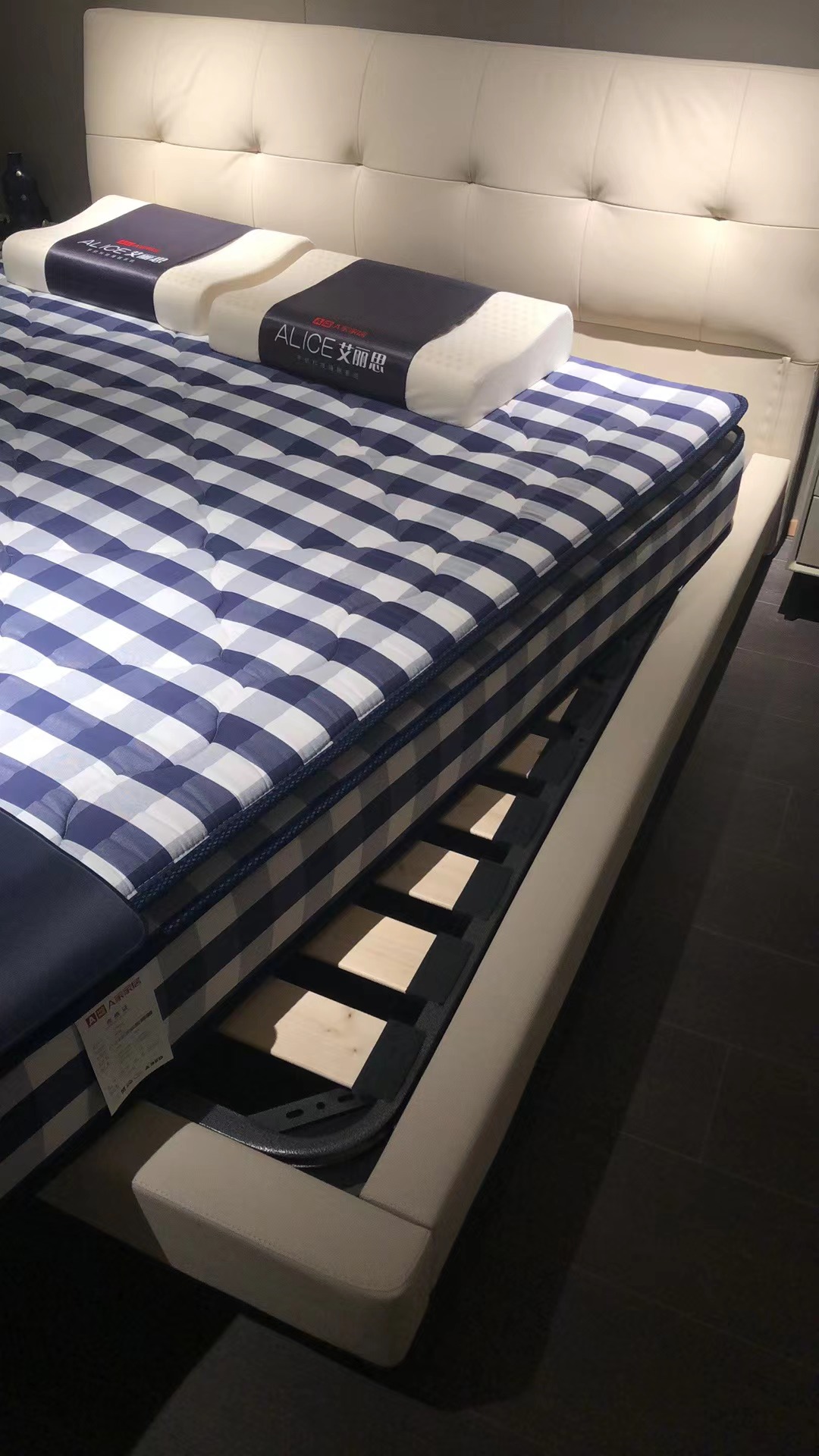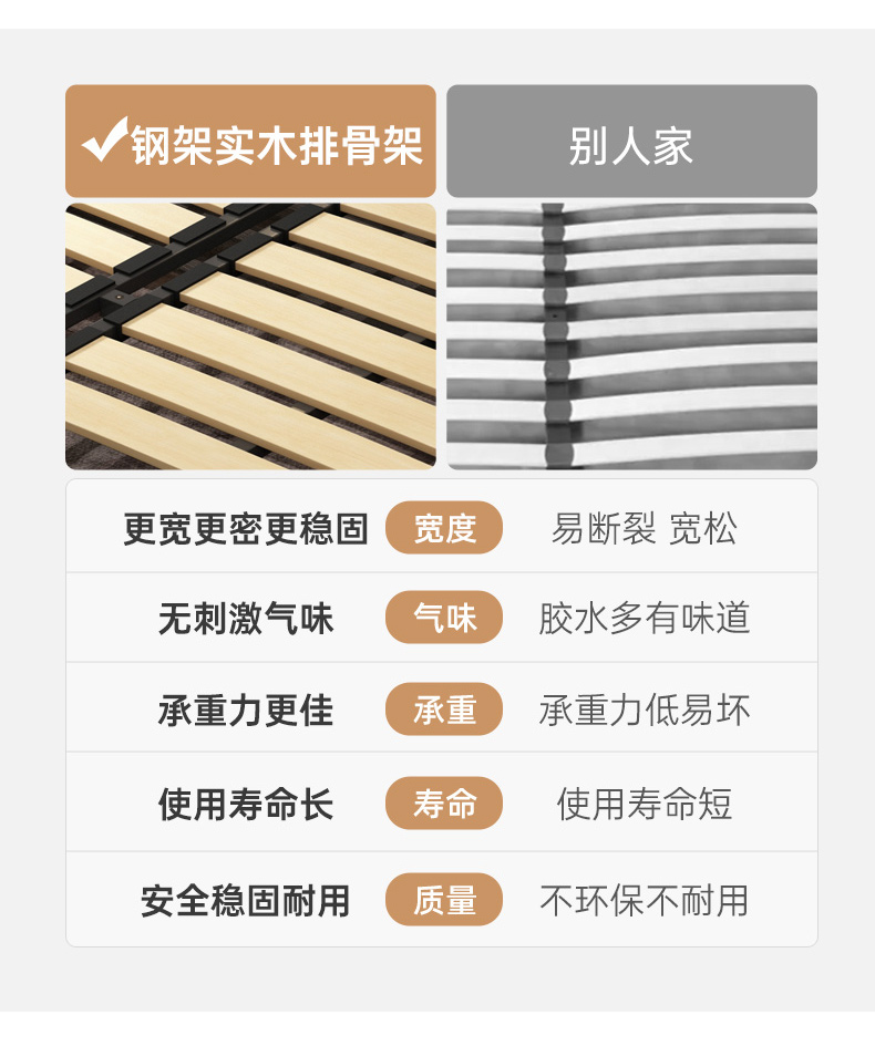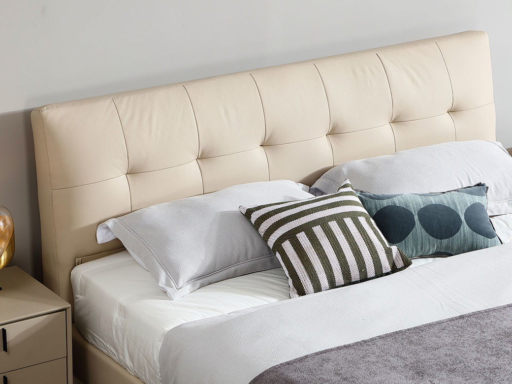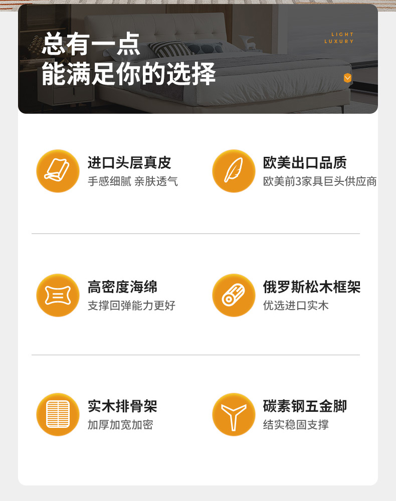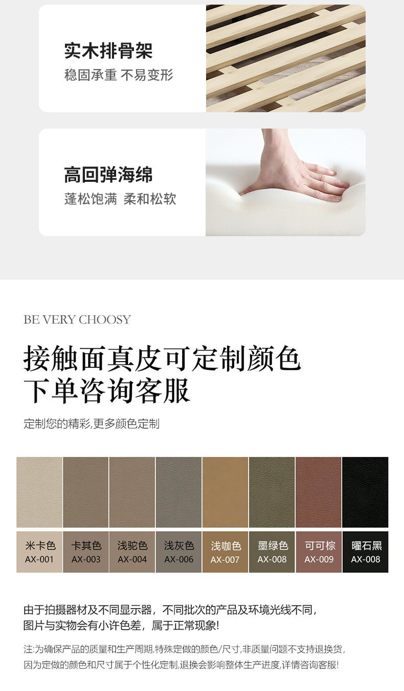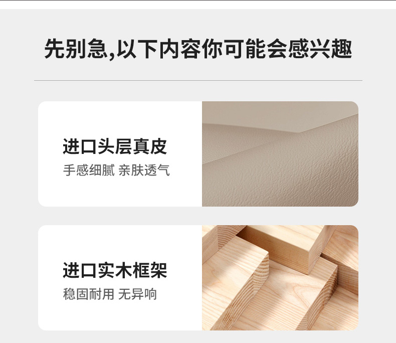 B系优选 现代简约 接触面真皮+仿皮+木框架高密 度回弹海绵+静音防滑实木十分排骨条+静音条 1.5米 真皮软床(价格不含高箱,如需定制请咨询客服)¥2819