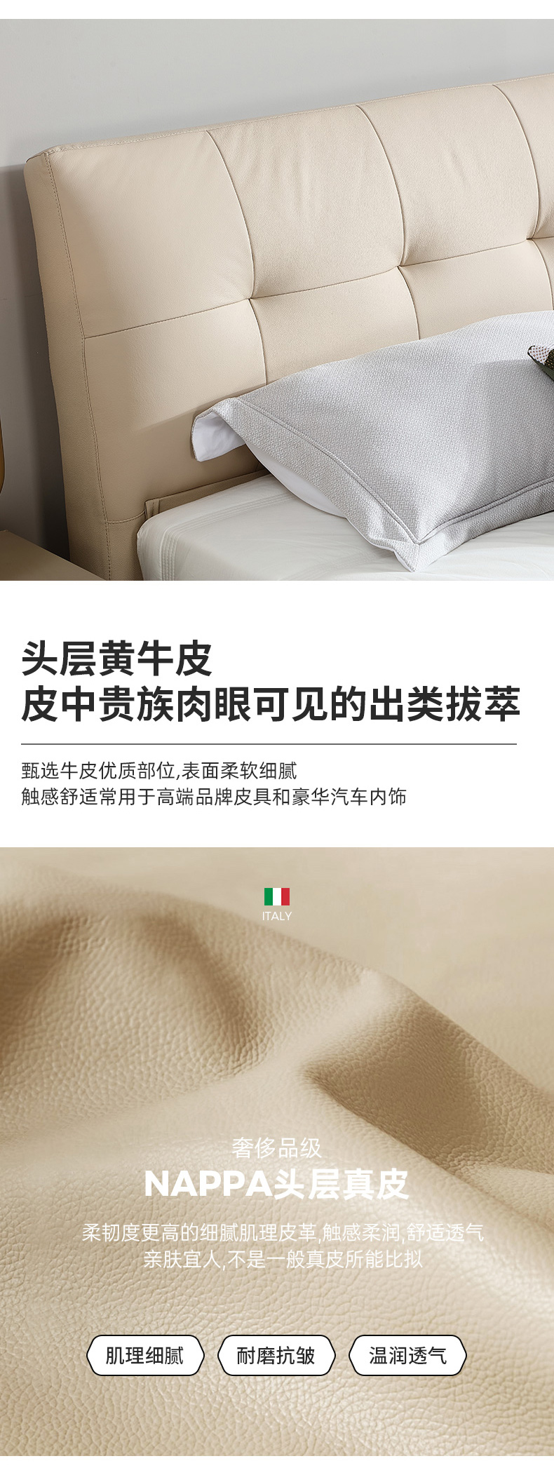 A系优选 现代简约 全实木框架 接触面头层牛皮 高密度海绵 1.8米床(价格不含高箱,如需定制请咨询客服)¥2819