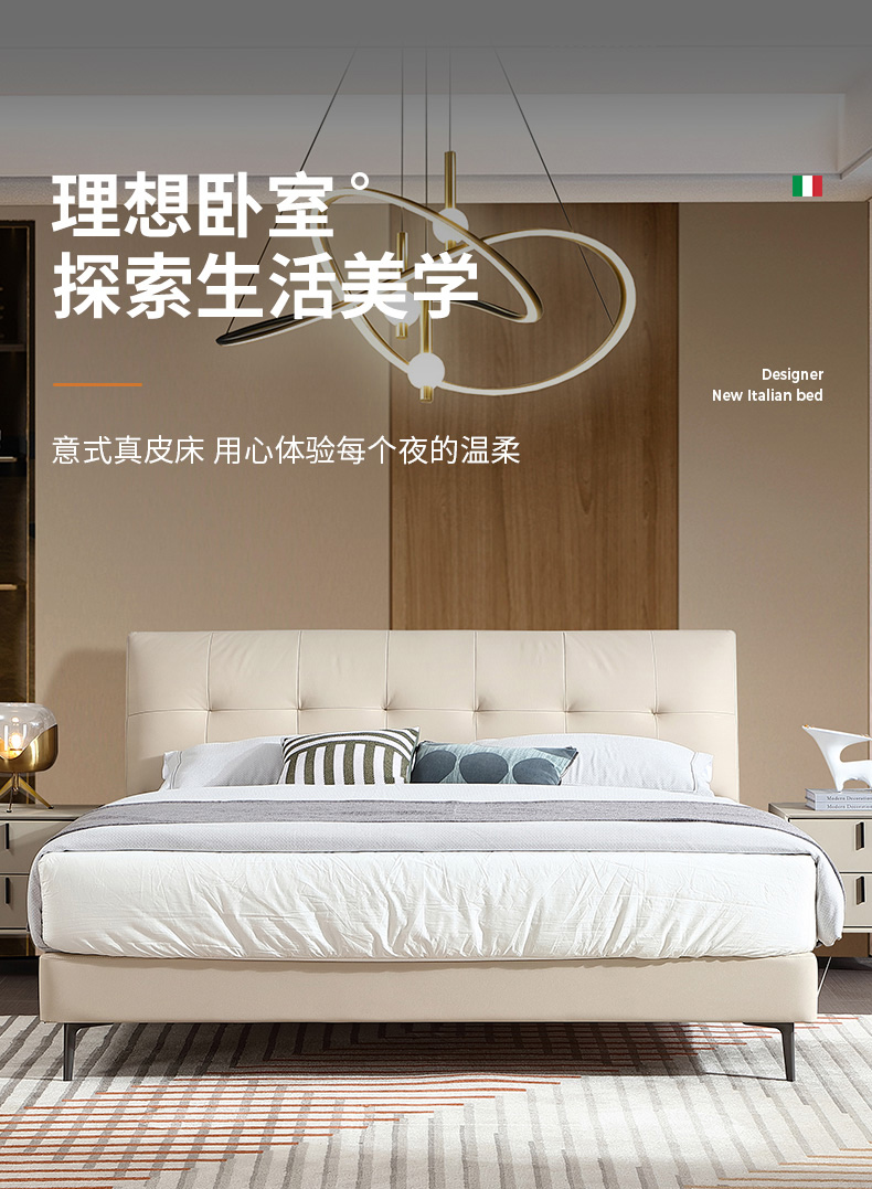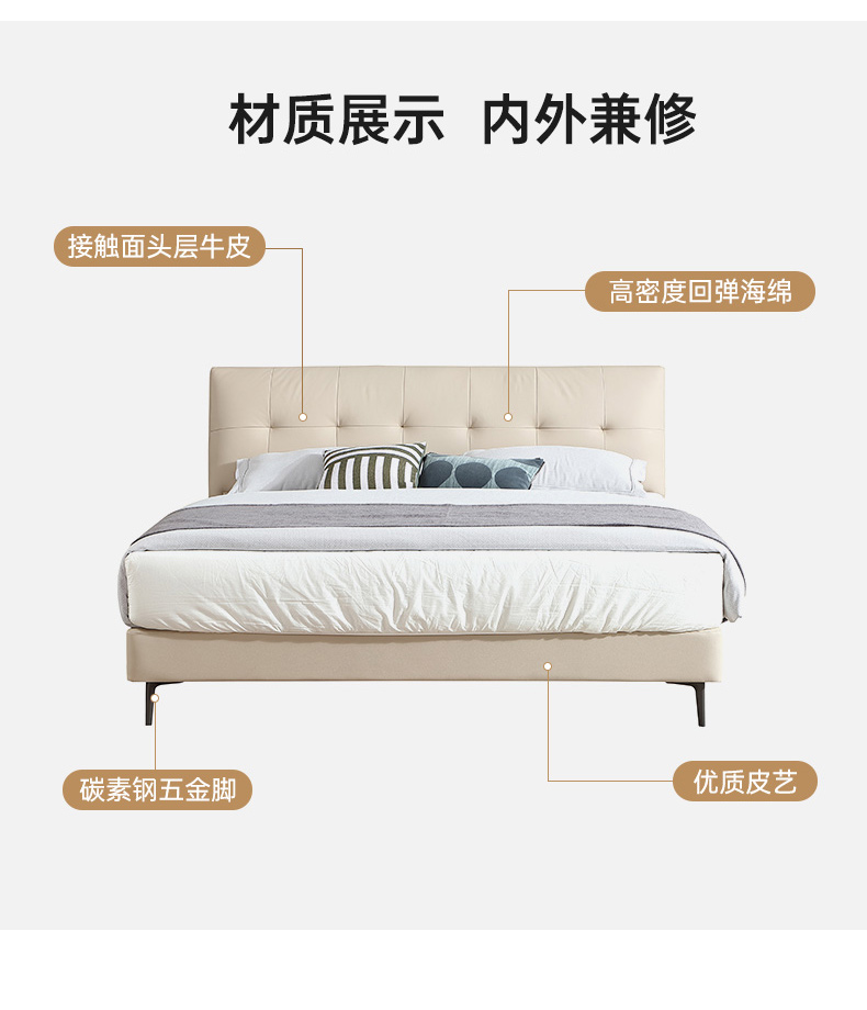 A系优选 现代简约 全实木框架 接触面头层牛皮 高密度海绵 1.8米床(价格不含高箱,如需定制请咨询客服)