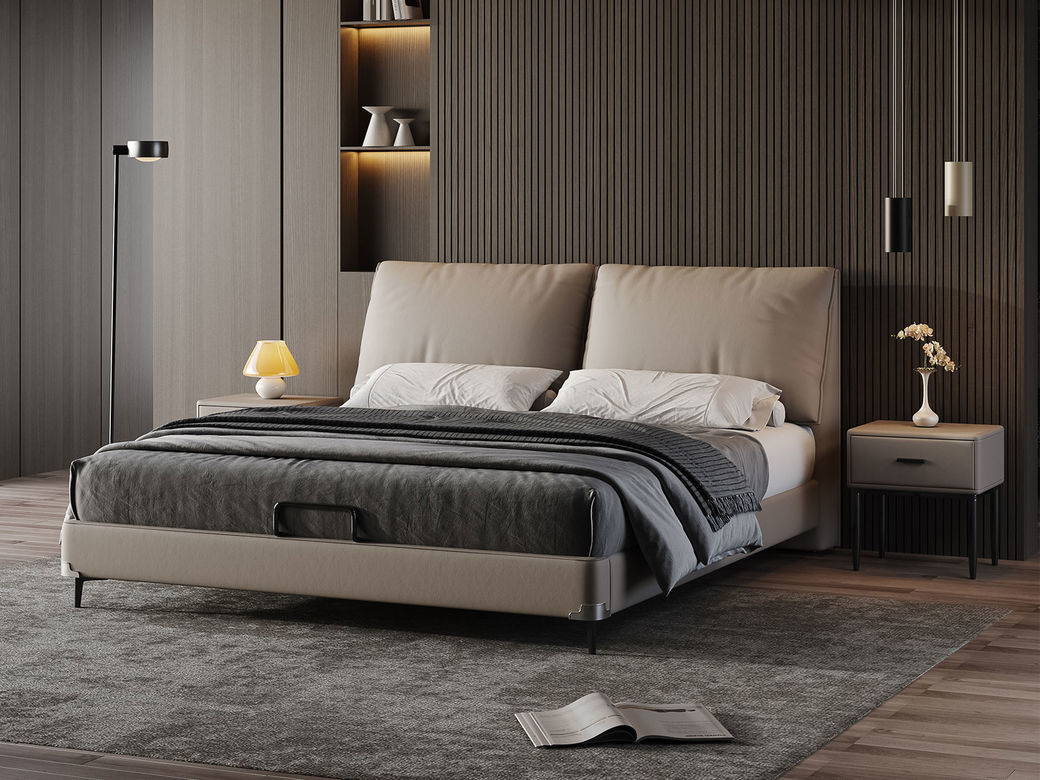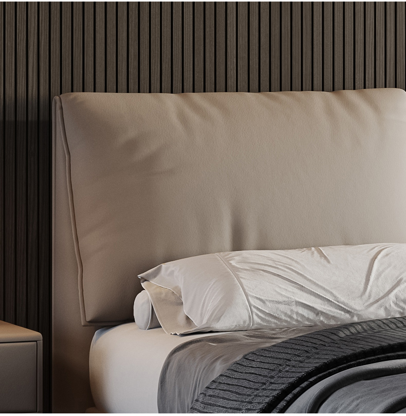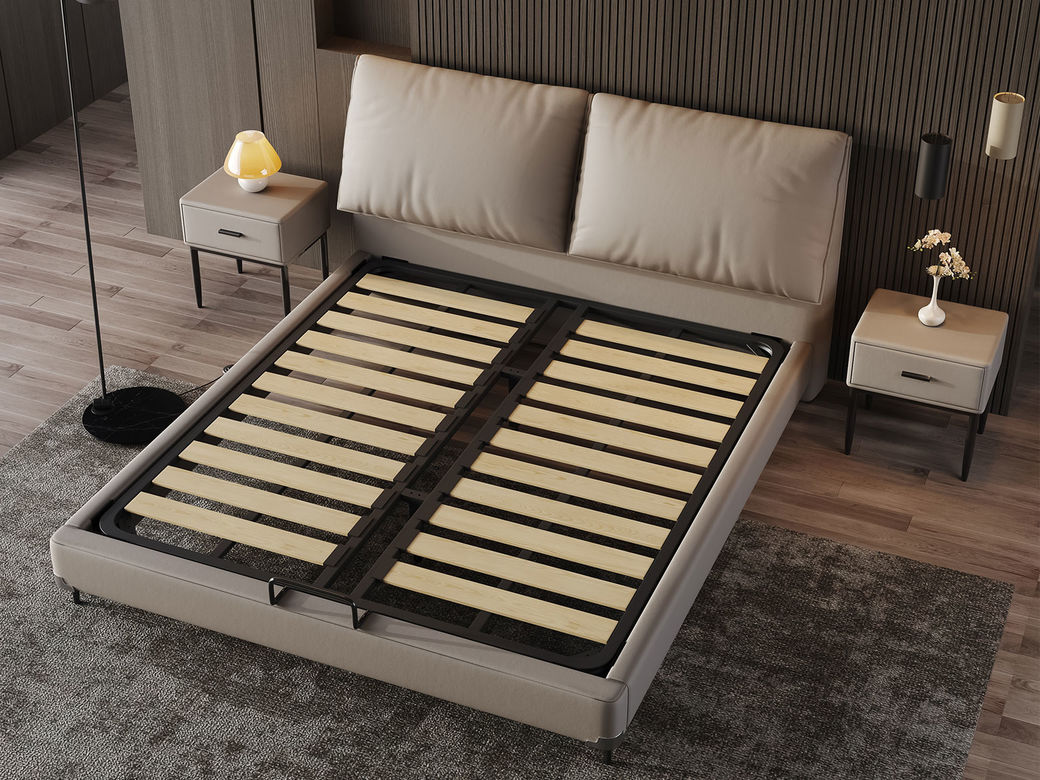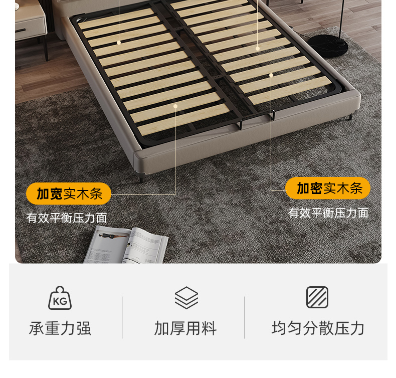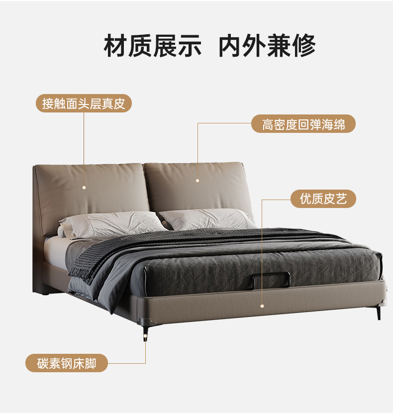 B系优选 现代简约 接触面真皮+仿皮+木框架高密 度回弹海绵+静音防滑实木十分排骨条+静音条 1.5米 真皮软床(价格不含高箱,如需定制请咨询客服)¥2819