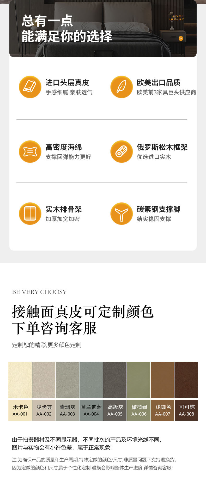 B系优选 现代简约 接触面真皮+仿皮+木框架高密 度回弹海绵+静音防滑实木十分排骨条+五金脚+静音条 卡其色加上配色 1.5米 真皮软床(价格不含高箱,如需定制请咨询客服)| 商品详情 | 规格参数 | 评价(0) | 购买咨询() | 产品实拍图 | 服务标准 |