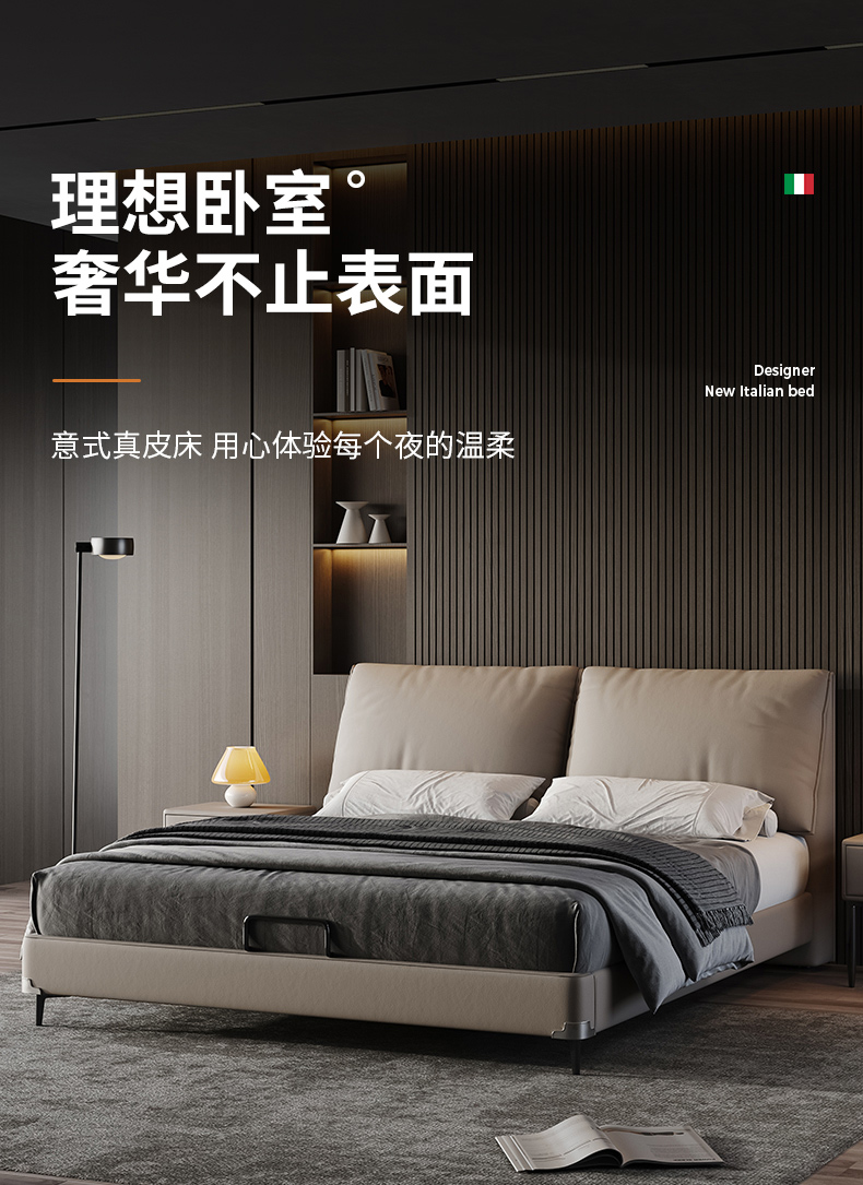 A系优选 现代简约 全实木框架 接触面头层牛皮 高密度海绵 1.8米床(价格不含高箱,如需定制请咨询客服)