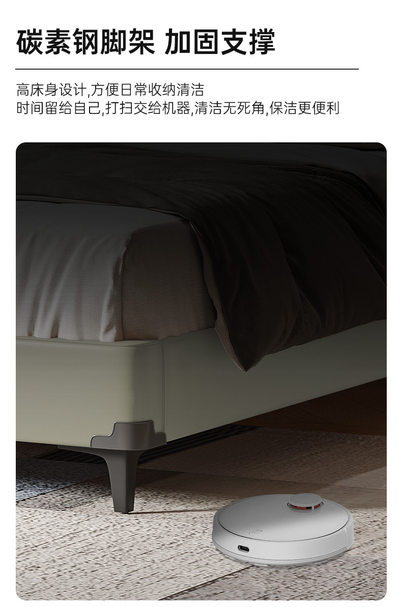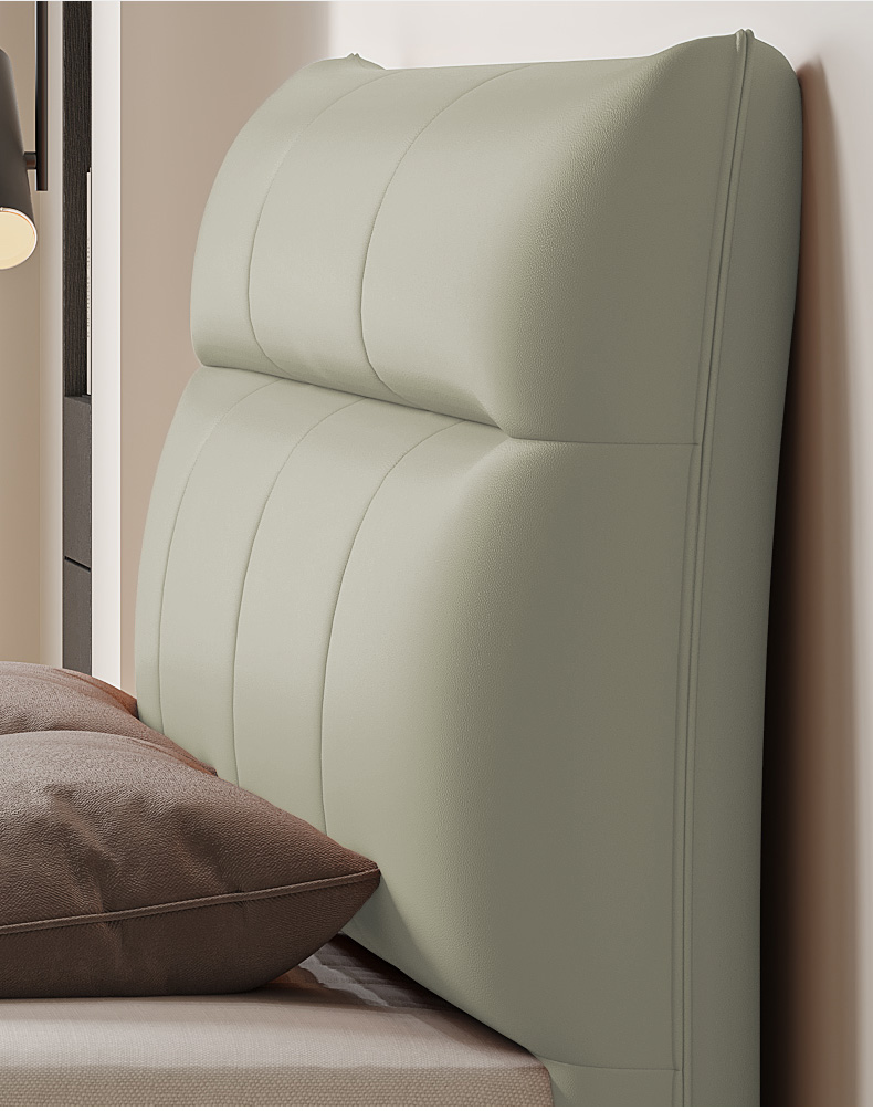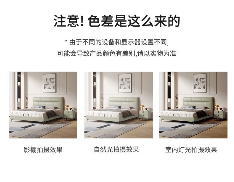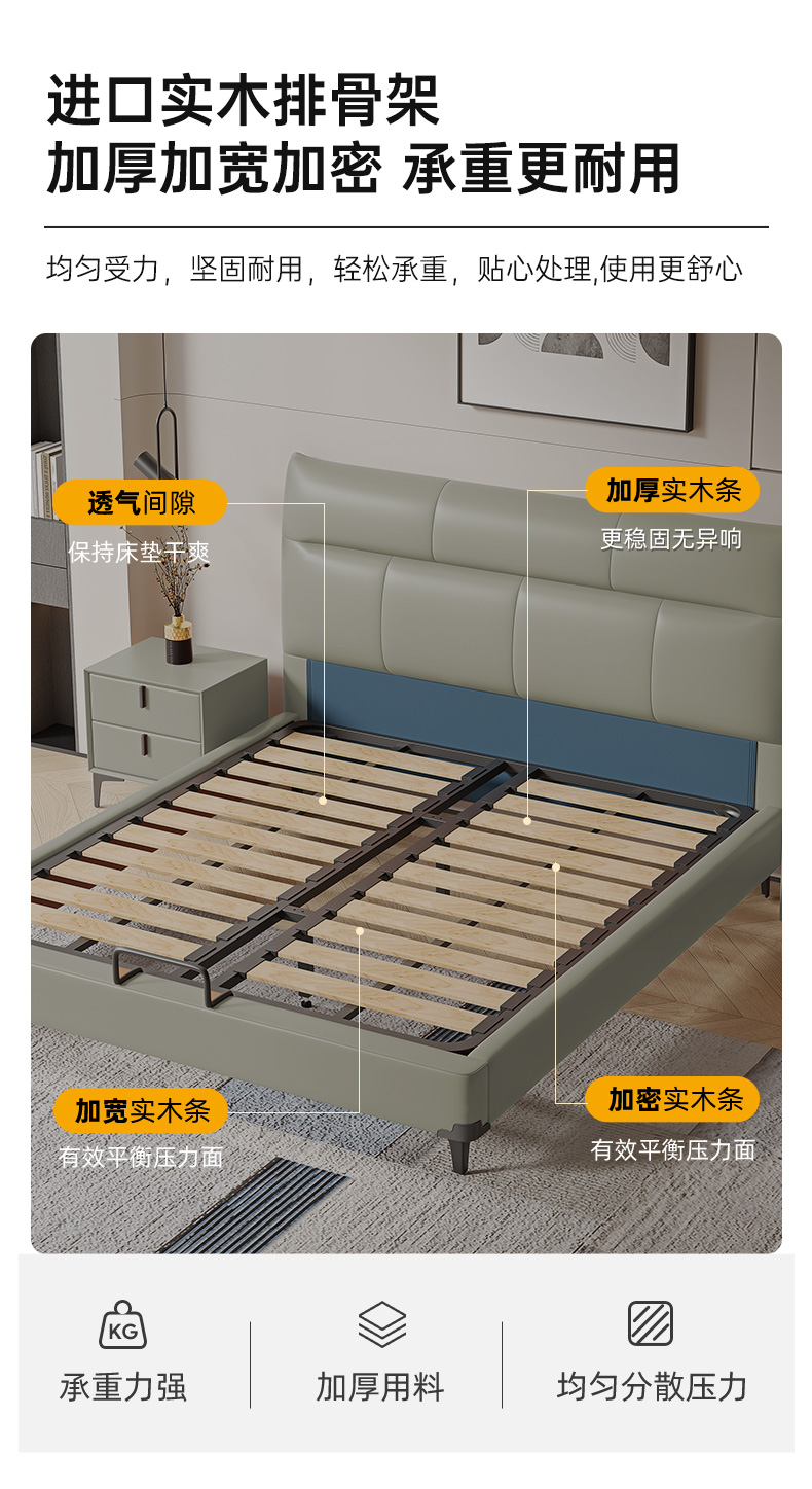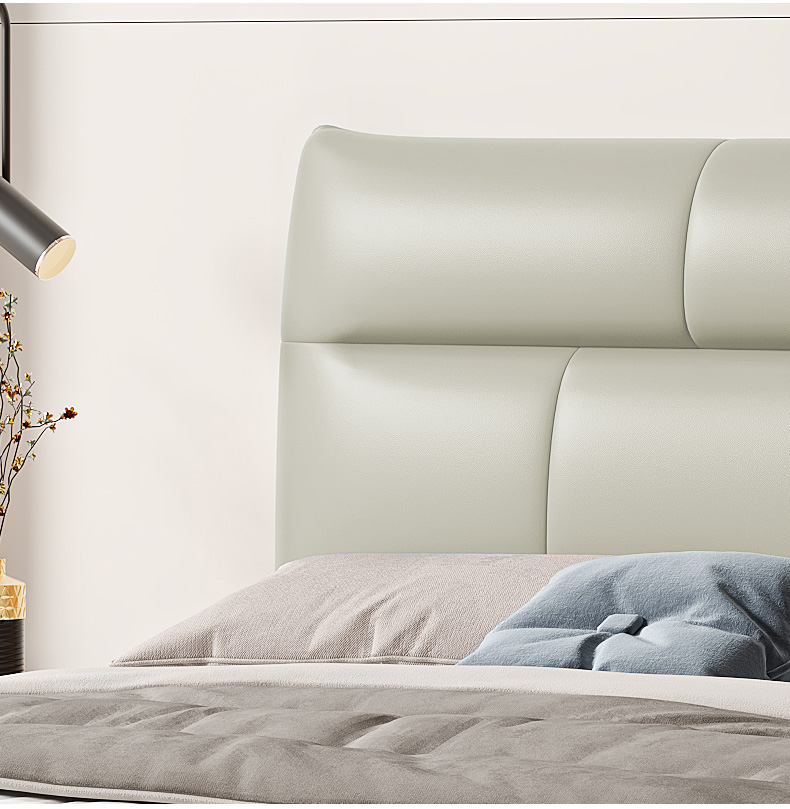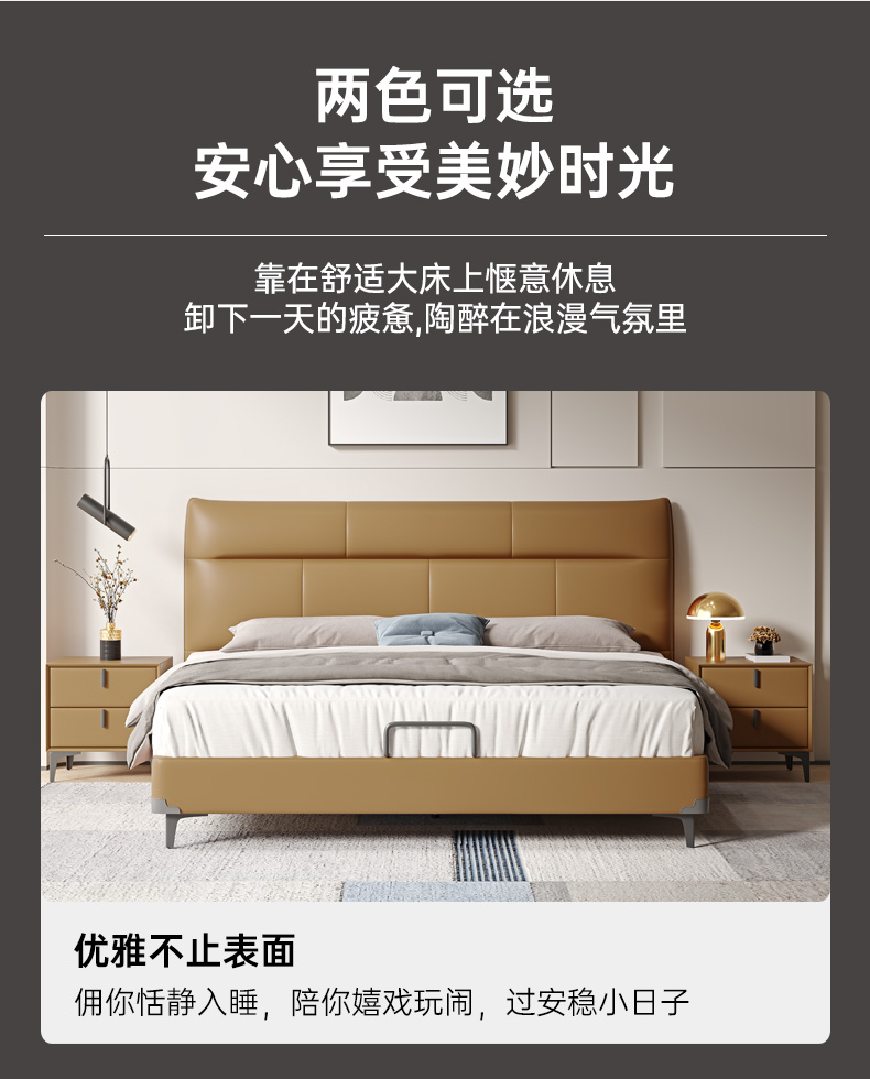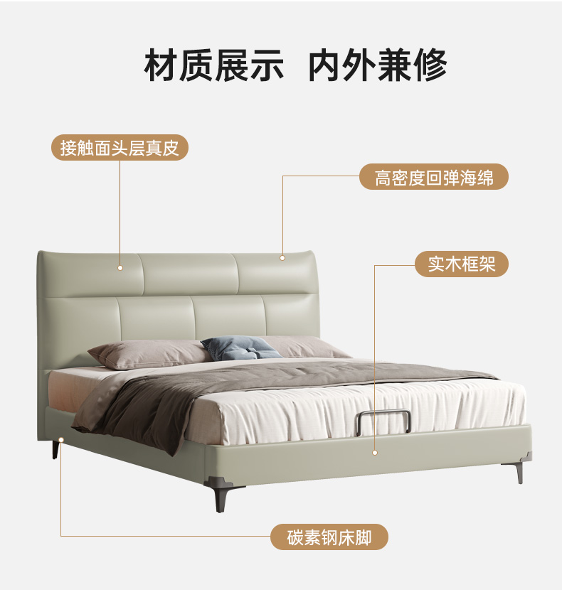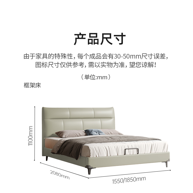 B系优选 现代简约 接触面真皮+仿皮+木框架高密 度回弹海绵+静音防滑实木十分排骨条+静音条 1.5米 真皮软床(价格不含高箱,如需定制请咨询客服)¥2819
