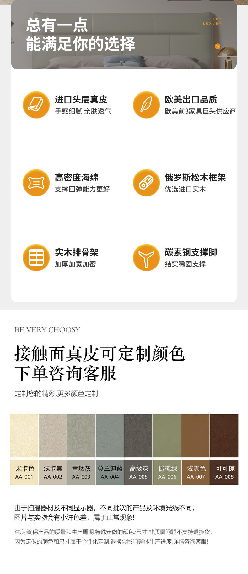 B系优选 现代简约 接触面真皮+仿皮+木框架高密 度回弹海绵+静音防滑实木十分排骨条+五金脚+静音条 卡其色加上配色 1.5米 真皮软床(价格不含高箱,如需定制请咨询客服)| 商品详情 | 规格参数 | 评价(0) | 购买咨询() | 产品实拍图 | 服务标准 |