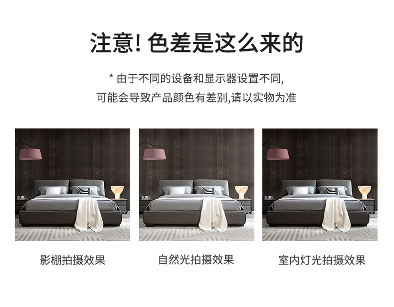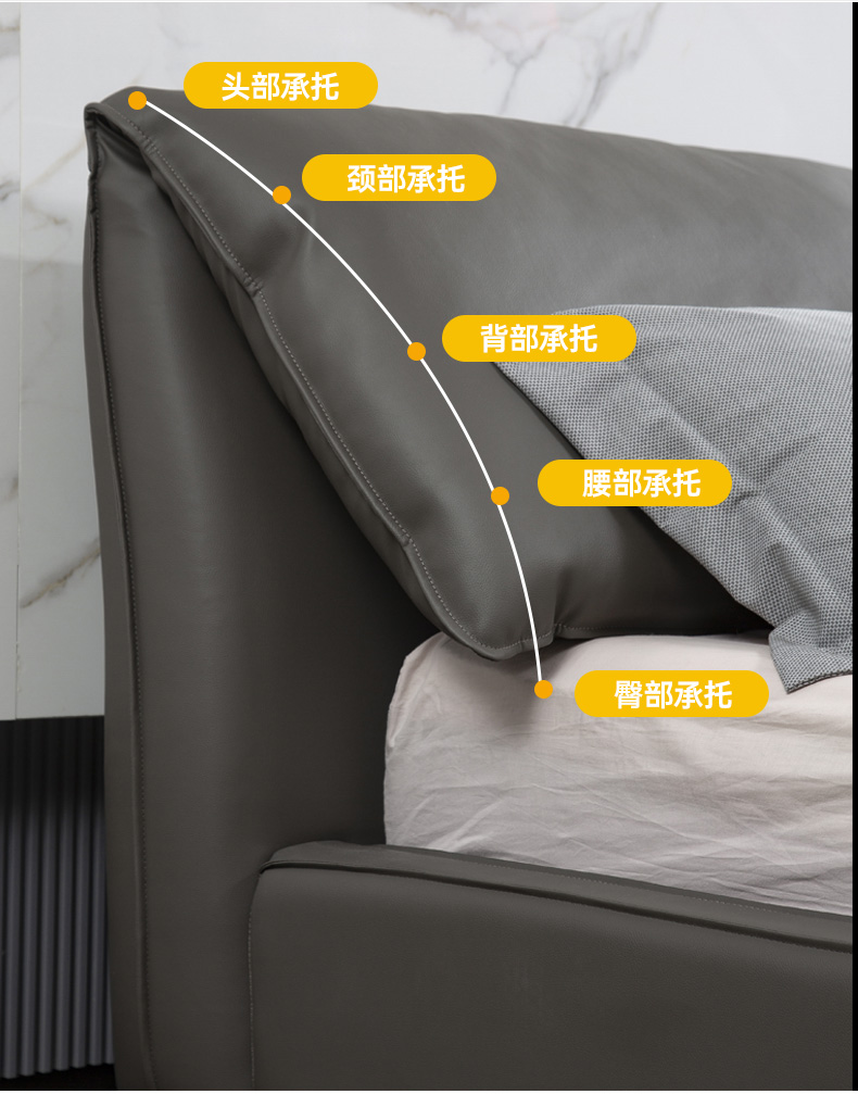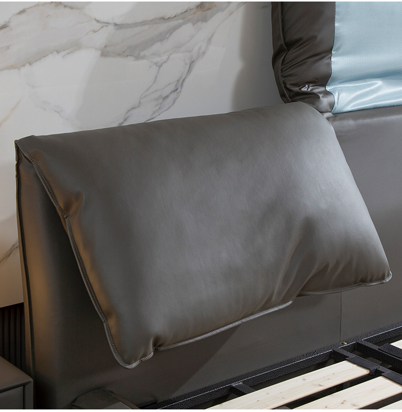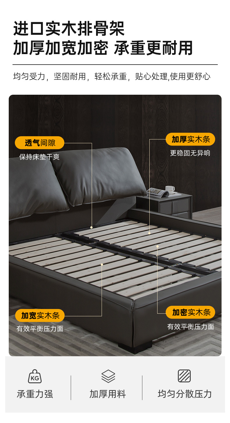 B系优选 现代简约 接触面真皮+仿皮+木框架高密 度回弹海绵+静音防滑实木十分排骨条+静音条 1.5米 真皮软床(价格不含高箱,如需定制请咨询客服)¥2819